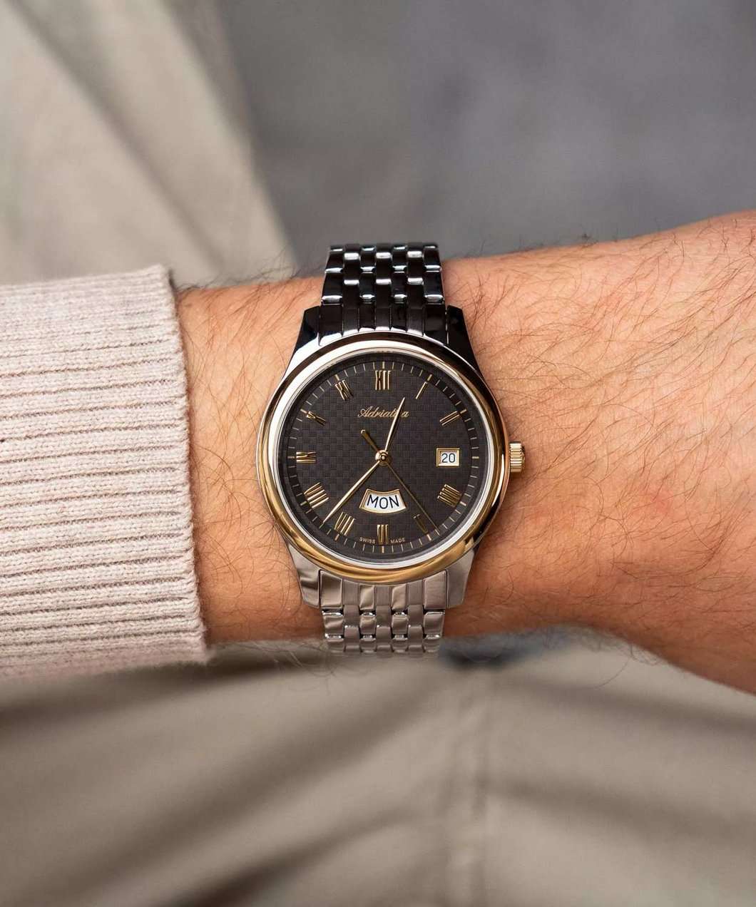 Часы Adriatica A1025.2166Q представляют собой идеальное сочетание элегантности и функциональности, разработанное для современных мужчин. Их стильный циферблат защищен сапфировым стекломСапфировое стеклоПрочный и надёжный материал из кристалла сапфира синтетического происхождения, характеризующийся особой твёрдостью и устойчивостью к царапинам и повреждениям., что придает дополнительную устойчивость к царапинам. Корпус из нержавеющей стали подчеркивает их изысканность и долговечность. Надежный кварцевый механизм с калибром RONDA 517 гарантирует точность времени, а водозащита WR 50 (5 ATM) обеспечивает защиту от воды в различных условиях. Браслет из нержавеющей стали с раскладной застёжкойРаскладная застёжкаТакой тип застёжки используется только на браслетах из металла. Она никогда не раскрывается полностью, происходит разделение на 2 и более частей. Раскладывающая застёжка снизит вероятность потери часов к минимуму., гармонично дополняет общий дизайн и обеспечивает комфортное ношение на запястье. Окошко даты находится в положении 3 часа. День недели отображается в положении 6 часов. БезельБезельВнешний ободок, закрепляющий стекло. В спортивных часах так называется поворотное кольцо с делениями на циферблате, выполняет роль таймера – замеряет отрезки времени на шкале. Неподвижный безель – элемент декора. Однонаправленно вращающийся безель на дайверских часах позволяет фиксировать моменты погружения и выныривания на поверхность. с PVD-покрытиемPVDУльтратонкое покрытие наносится в технике вакуумного напыления, сочетает в себе нитрид титана особой прочности со слоем золота или оксида хрома. Несёт в себе декоративную или защитную функцию..