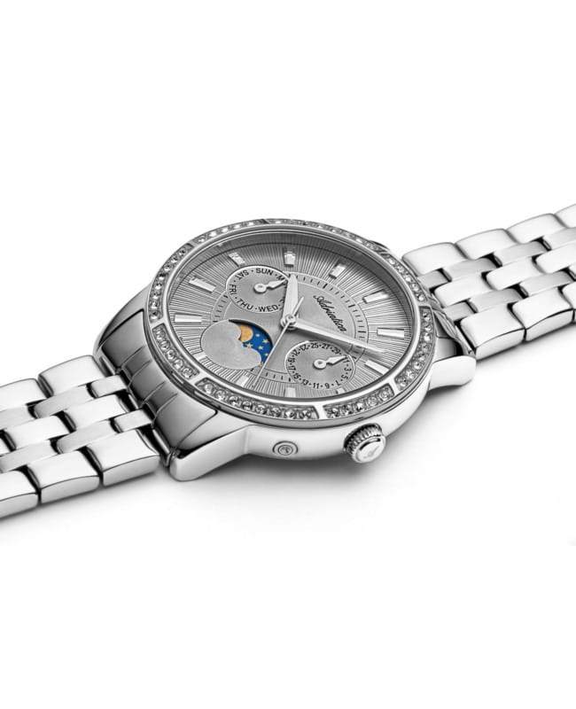 Женские часы Adriatica Moonphase A3601.5117QFZ имеют кварцевый механизм с высокой точностью. Сапфировое стеклоСапфировое стеклоПрочный и надёжный материал из кристалла сапфира синтетического происхождения, характеризующийся особой твёрдостью и устойчивостью к царапинам и повреждениям. устойчивое к появлению царапин, обладающее высокой прозрачностью, защищает изящный серебристый циферблат. Корпус часов изготовлен из нержавеющей стали, на безелеБезельВнешний ободок, закрепляющий стекло. В спортивных часах так называется поворотное кольцо с делениями на циферблате, выполняет роль таймера – замеряет отрезки времени на шкале. Неподвижный безель – элемент декора. Однонаправленно вращающийся безель на дайверских часах позволяет фиксировать моменты погружения и выныривания на поверхность. расположились фианиты, что придает часам утонченный и стильный вид. Браслет из нержавеющей стали с раскладной застёжкойРаскладная застёжкаТакой тип застёжки используется только на браслетах из металла. Она никогда не раскрывается полностью, происходит разделение на 2 и более частей. Раскладывающая застёжка снизит вероятность потери часов к минимуму., гармонично дополняет общий дизайн и обеспечивает комфортное ношение на запястье. Надежный кварцевый механизм с калибром RONDA 706 гарантирует точность времени, а водозащита 50 метров, что позволит защитить корпус от случайных брызг или капель дождя. Часы оснащены тремя дополнительными циферблатами с функциями отображения числа месяца, дня недели и фазы Луны, что придает им неповторимый характер.
