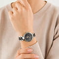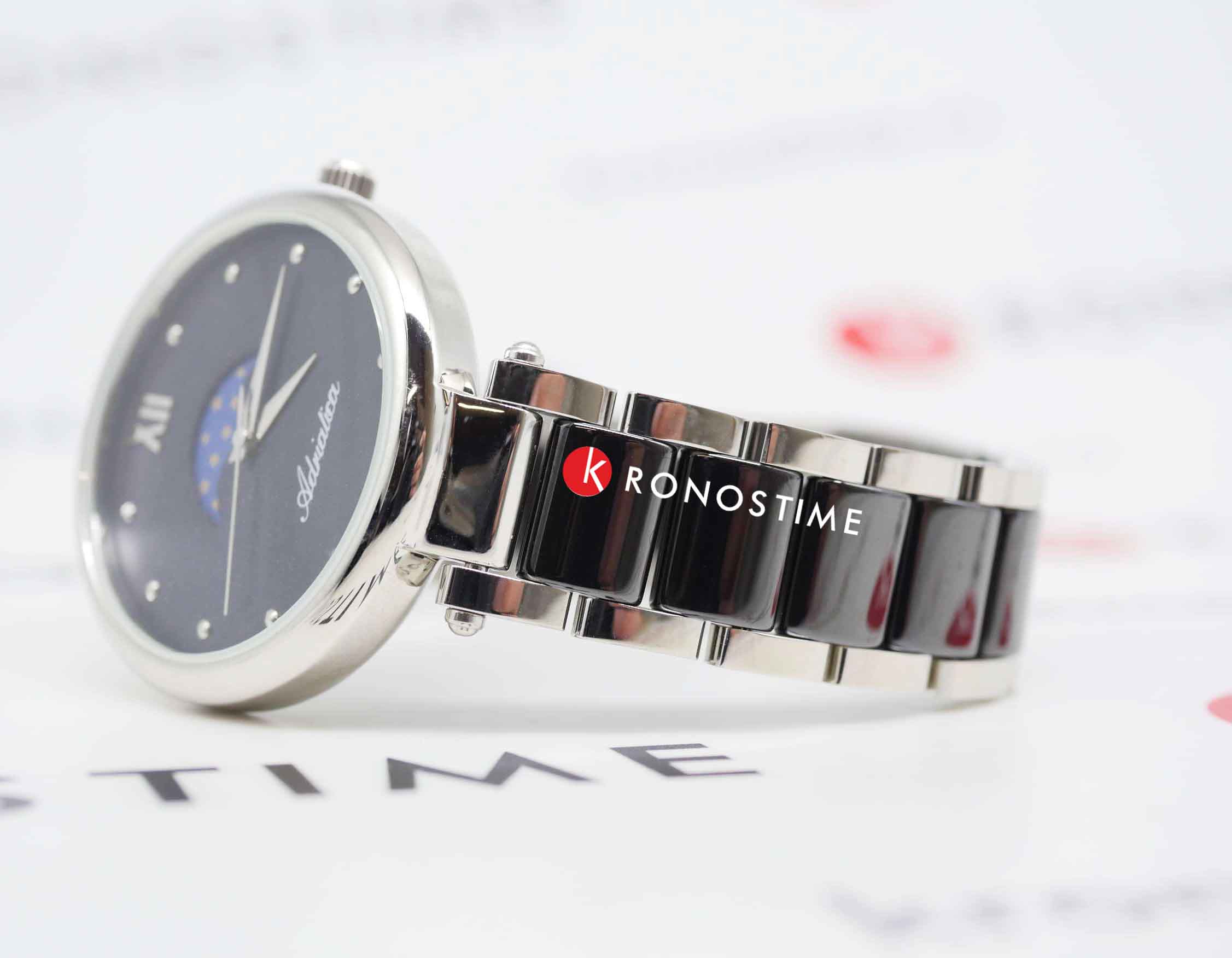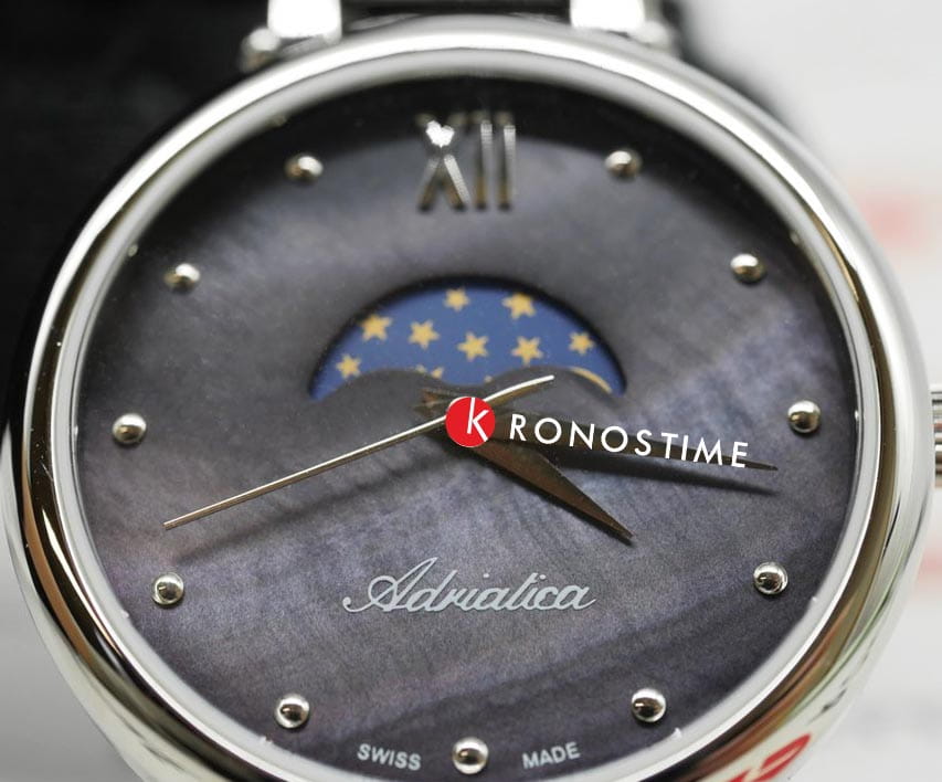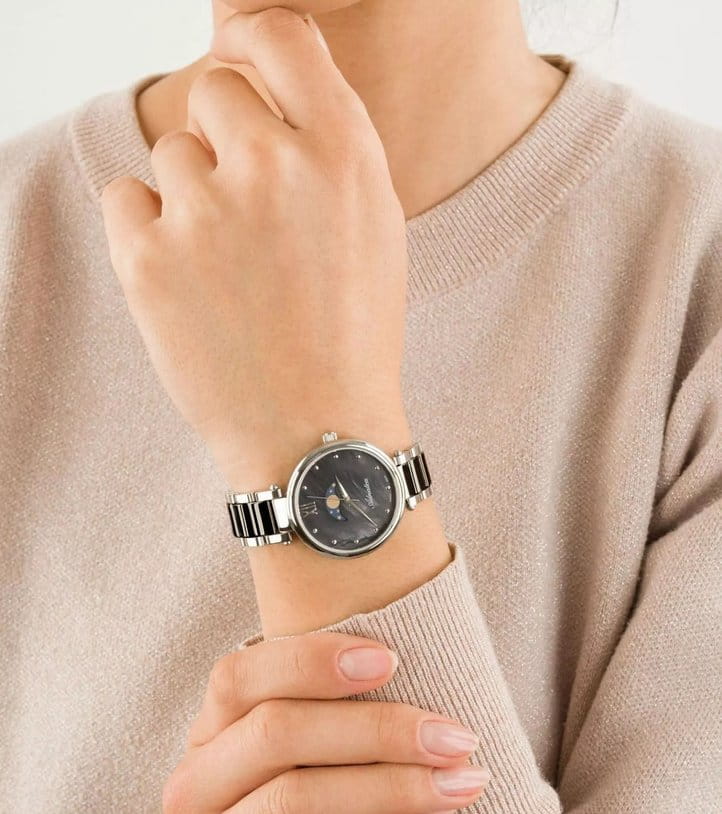 Женские часы Adriatica A3705.E18MQM представляют собой гармонию изысканности и функциональности, создавая идеальный аксессуар для тех, кто ценит качество и стиль. Эти швейцарские часы оснащены надежным кварцевым механизмом с калибром Ronda 788, который гарантирует точность и долговечность. Корпус, выполненный из нержавеющей стали, имеет диаметр 34 мм и толщину 7 мм, что придаёт ему утончённый и современный вид. Перламутровый черный циферблат, защищённый минеральным стекломМинеральное стеклоМинеральное стекло представляет собой искусственно выращенный минерал кварца. Такое стекло отличается особой устойчивостью к повреждениям и царапинам. Уступает по некоторым качествам сапфировому стеклу., добавляет элегантности и привлекает внимание. Особое внимание заслуживает браслет из нержавеющей стали с черными биокерамическимиБиокерамикаБиокерамика — это материал, который на две трети состоит из керамики, на одну треть — из биопластика. Он сочетает в себе лучшие качества обоих материалов и обладает прочностью и шелковистой на ощупь текстурой. вставками, который обеспечивает комфорт и надёжность при носке, а ювелирная застёжка добавляет дополнительный акцент на изысканность. Функция отображения фазы луны придаёт часам уникальность и делает их не только стильным, но и функциональным аксессуаром. Водозащита уровня 50WR позволяет не беспокоиться о воздействии влаги, что увеличивает практичность часов в повседневной жизни. Часы Adriatica A3705.E18MQM — это символ швейцарского качества, сочетающий в себе современные технологии и классический дизайн.