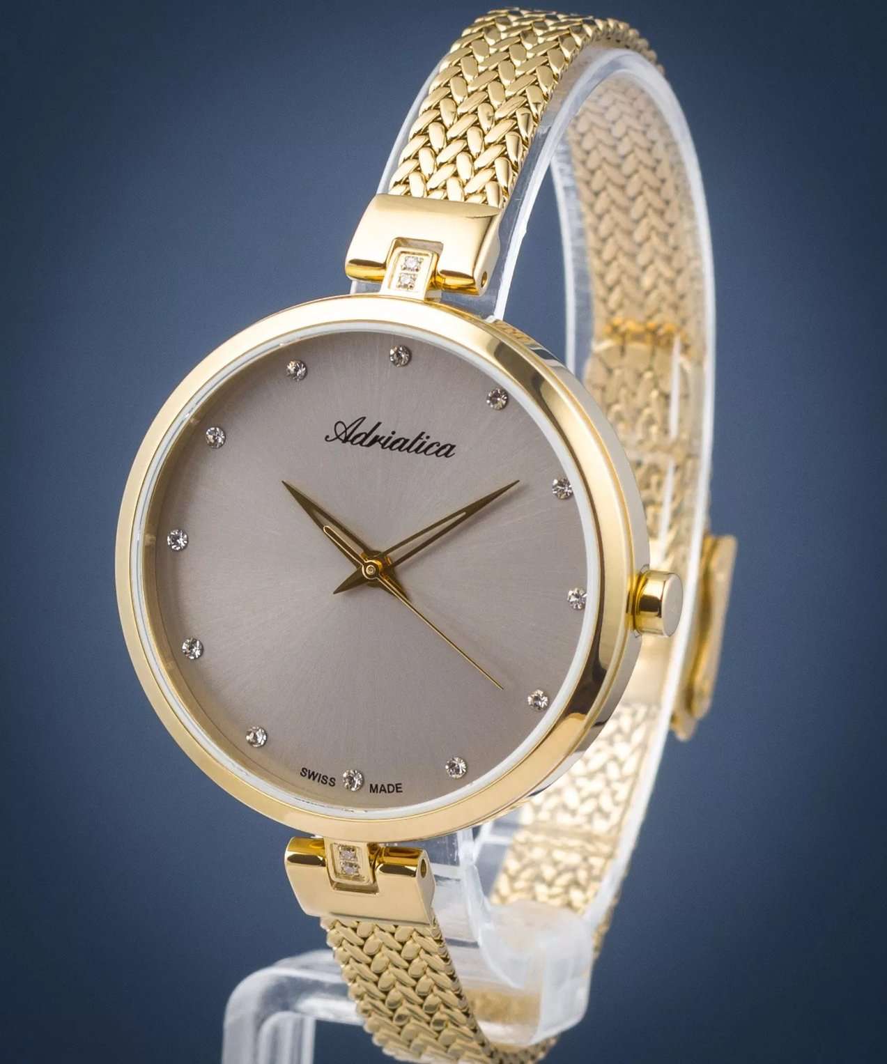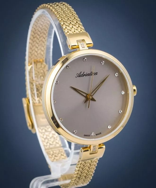 Изысканные женские часы Adriatica A3819.1147Q, произведенные в Швейцарии. Эти часы идеально подойдут для женщин, ценящих элегантность и стиль. Часы оснащены надежным кварцевым механизмом Ronda 763, обеспечивающим точность и долговечность. Корпус диаметром 34 мм и толщиной 7 мм выполнен из стали с PVDPVDУльтратонкое покрытие наносится в технике вакуумного напыления, сочетает в себе нитрид титана особой прочности со слоем золота или оксида хрома. Несёт в себе декоративную или защитную функцию. покрытием, что придает часам современный и утонченный вид. Серый циферблат, украшенный кристаллами, придает дополнительное сияние и изысканность. Минеральное стеклоМинеральное стеклоМинеральное стекло представляет собой искусственно выращенный минерал кварца. Такое стекло отличается особой устойчивостью к повреждениям и царапинам. Уступает по некоторым качествам сапфировому стеклу. защищает циферблат от повреждений, а водозащита уровня 30WR позволяет использовать часы в условиях легкой влажности. Стальной браслет с PVDPVDУльтратонкое покрытие наносится в технике вакуумного напыления, сочетает в себе нитрид титана особой прочности со слоем золота или оксида хрома. Несёт в себе декоративную или защитную функцию. покрытием золотистого цвета и раскладным замкомРаскладной замокДанный вариант застежки используется только на часах с металлическим браслетом. Отличительная особенность такого крепления в том, что длина браслета становится универсальной и вы можете самостоятельно отрегулировать нужный вам размер – застежка просто двигается по браслету часов. обеспечивает комфортное ношение и надежную фиксацию на запястье.