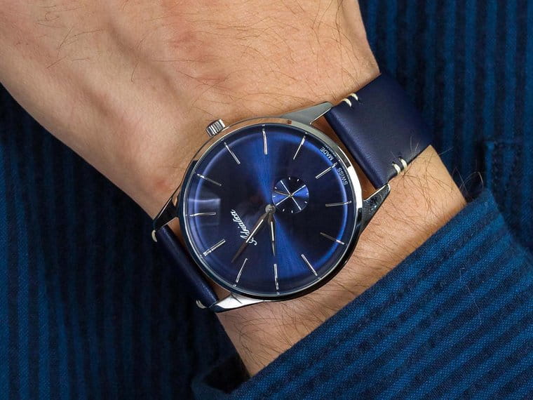 Часы Adriatica A8264.5215Q воплощают в себе элегантность и функциональность, идеально подходящие для современных мужчин, ценящих швейцарское качество. Их синий циферблат, защищенный минеральным стекломМинеральное стеклоМинеральное стекло представляет собой искусственно выращенный минерал кварца. Такое стекло отличается особой устойчивостью к повреждениям и царапинам. Уступает по некоторым качествам сапфировому стеклу., заключен в корпус из нержавеющей стали диаметром 40 мм и толщиной 10 мм. Надежный кварцевый механизм с калибром ETA 902 обеспечивает высокую точность, а водозащита 5 ATM делает часы устойчивыми к воздействию воды. Изящная вынесенная секундная стрелка добавляет стильный акцент. Кожаный синий браслет обеспечивает комфортное ношение и подчеркивает утонченность дизайна. Весом всего 45 г, они практически не ощущаются на запястье. А люминесцентное покрытиеЛюминесцентное покрытиеПозволяет считывать показания времени в темноте. Производители наносят на стрелки, часовые индексы, безель или поверхность циферблата светонакопительный состав, дающий холодное свечение. на стрелках облегчает чтение времени в условиях низкой освещенности.