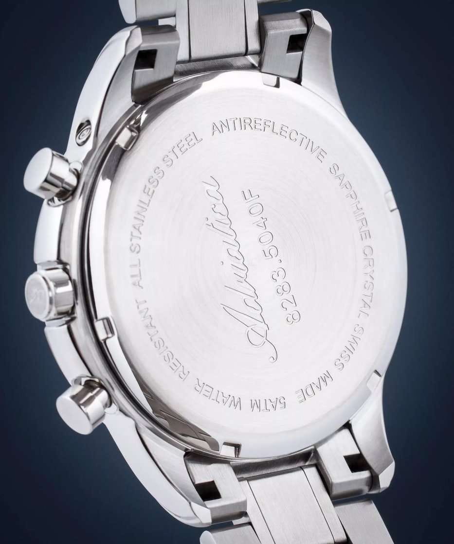 Мужские швейцарские часы-хронографХронографФункция позволяет измерять отрезки времени с особой точностью: часы, минуты, секунды. Верным признаком хронографа является наличие на циферблате 3 дополнительных окошек-счётчиков. с секундомеромСекундомерСекундоме́р — прибор, способный измерять интервалы времени с точностью до долей секунды. Adriatica Passion A8283.51R6CH имеют кварцевый механизм с высокой точностью. Сапфировое стеклоСапфировое стеклоПрочный и надёжный материал из кристалла сапфира синтетического происхождения, характеризующийся особой твёрдостью и устойчивостью к царапинам и повреждениям. устойчивое к появлению царапин, обладающее высокой прозрачностью защищает текстурированный черный циферблат с метками в виде штрихов и арабской цифры 12. Месяц и день недели отображаются в отдельных окошках, а дата отображается центральной стрелкой, также часы имеют 3 дополнительных циферблата. Корпус часов изготовлен из нержавеющей стали. На часовую, минутную стрелки нанесено люминесцентное покрытиеЛюминесцентное покрытиеПозволяет считывать показания времени в темноте. Производители наносят на стрелки, часовые индексы, безель или поверхность циферблата светонакопительный состав, дающий холодное свечение., которое светится в темноте, создавая необычное изображение. Стальной браслет с раскладной застёжкойРаскладная застёжкаТакой тип застёжки используется только на браслетах из металла. Она никогда не раскрывается полностью, происходит разделение на 2 и более частей. Раскладывающая застёжка снизит вероятность потери часов к минимуму. обеспечивает комфортное ношение и надежную фиксацию на запястье. Надежный кварцевый механизм с калибром RONDA 5040.F гарантирует точность времени, а водозащита 50 метров, позволит плавать, что позволит защитить корпус от случайных брызг или капель дождя.