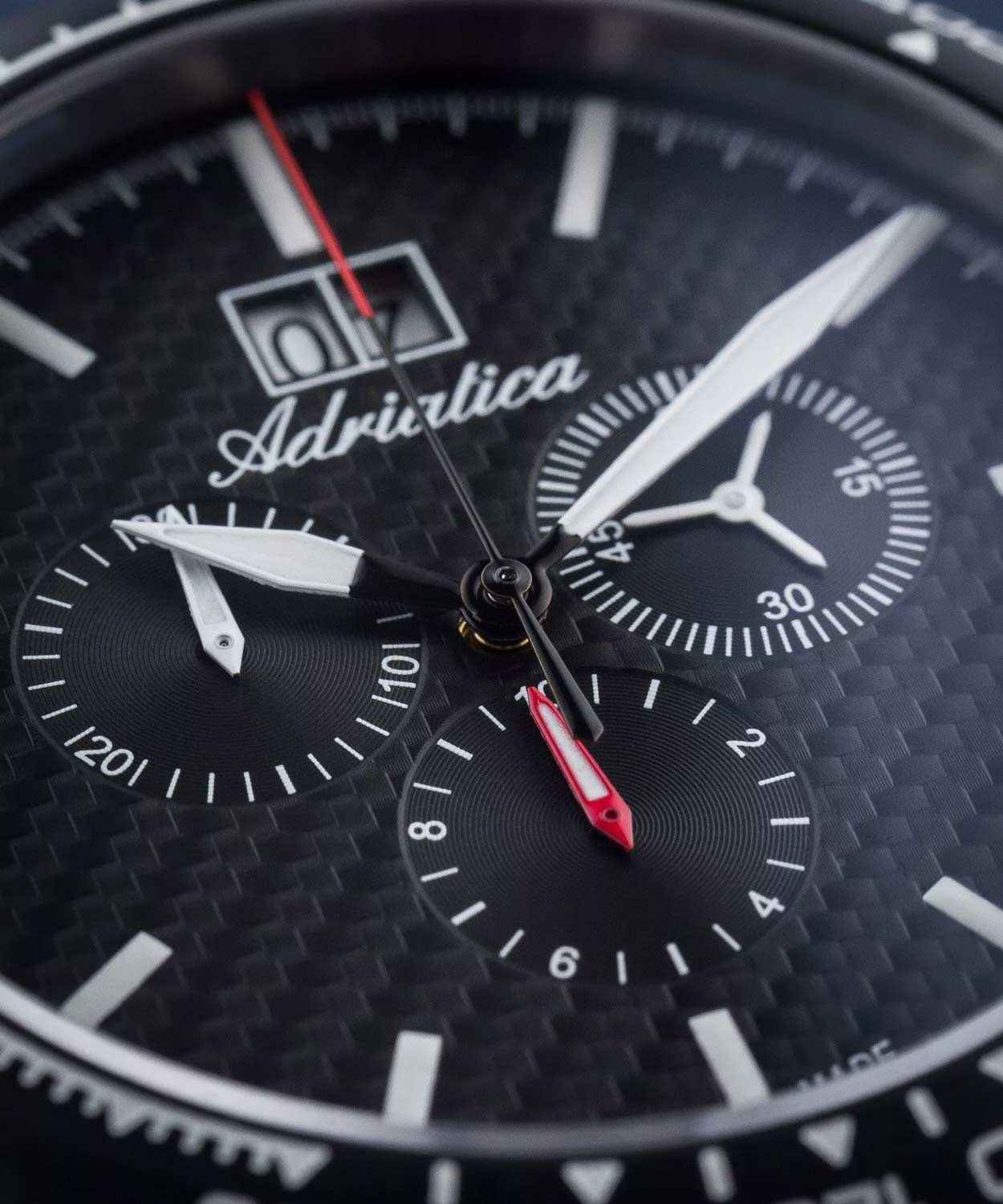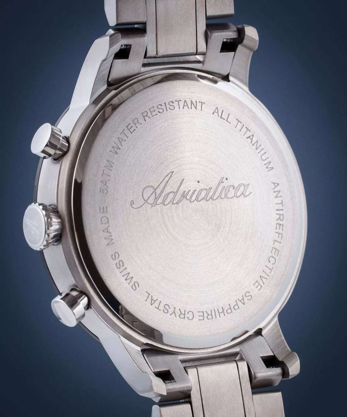 Мужские швейцарские часы-хронографХронографФункция позволяет измерять отрезки времени с особой точностью: часы, минуты, секунды. Верным признаком хронографа является наличие на циферблате 3 дополнительных окошек-счётчиков. с секундомеромСекундомерСекундоме́р — прибор, способный измерять интервалы времени с точностью до долей секунды. и тахиметромТахиметрРазмеченная шкала, располагается на ободке или безеле часов. Тахиметр позволяет рассчитать скорость на определённом участке пути, расстояние измеряется в километрах или милях. Adriatica Aviation A8383.4114CH воплощают в себе элегантность и функциональность, их выбирают целеустремленные мужчины, которые знают цену времени. Черный циферблат часов, защищенный сапфировым стекломСапфировое стеклоПрочный и надёжный материал из кристалла сапфира синтетического происхождения, характеризующийся особой твёрдостью и устойчивостью к царапинам и повреждениям., заключен в корпус из титана диаметром 46 мм и толщиной 12 мм. Надежный кварцевый механизм с калибром Ronda 5040.B обеспечивает высокую точность, а водозащита 5 ATM делает часы устойчивыми к воздействию воды. Стальной браслет с раскладной застёжкойРаскладная застёжкаТакой тип застёжки используется только на браслетах из металла. Она никогда не раскрывается полностью, происходит разделение на 2 и более частей. Раскладывающая застёжка снизит вероятность потери часов к минимуму. обеспечивает комфортное и надежное ношение. Циферблат с метками в виде штрихов имеет 3 дополнительных циферблата, а также окошко даты в положении «12» , что добавляет практичности в повседневной жизни. Люминесцентное покрытиеЛюминесцентное покрытиеПозволяет считывать показания времени в темноте. Производители наносят на стрелки, часовые индексы, безель или поверхность циферблата светонакопительный состав, дающий холодное свечение. на стрелках и метках обеспечивает отличную видимость в темноте.
