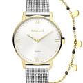 Amalys AMW-195 — женский набор, включающий часы и браслет, выполненный в едином элегантном стиле. Круглый корпус диаметром 33 мм изготовлен из нержавеющей стали с PVDPVDУльтратонкое покрытие наносится в технике вакуумного напыления, сочетает в себе нитрид титана особой прочности со слоем золота или оксида хрома. Несёт в себе декоративную или защитную функцию.-покрытием тёплого золотистого оттенка, что подчёркивает изысканный характер модели. Защитную функцию выполняет сапфировое стеклоСапфировое стеклоПрочный и надёжный материал из кристалла сапфира синтетического происхождения, характеризующийся особой твёрдостью и устойчивостью к царапинам и повреждениям., стойкое к царапинам и сохраняющее прозрачность. Механизм — кварцевый, обеспечивающий точность хода и удобство в использовании. Водозащита 3 ATM защищает от случайных брызг и дождя. Циферблат оформлен в минималистичном стиле с тонкими метками и изящными стрелками, подчёркивающими женственный образ. Стальной браслет миланского плетения с на раскладном замкеРаскладной замокДанный вариант застежки используется только на часах с металлическим браслетом. Отличительная особенность такого крепления в том, что длина браслета становится универсальной и вы можете самостоятельно отрегулировать нужный вам размер – застежка просто двигается по браслету часов. мягко облегает запястье и гармонично сочетается с корпусом. Дополняющий набор браслет усиливает впечатление цельности и придаёт образу завершённость.