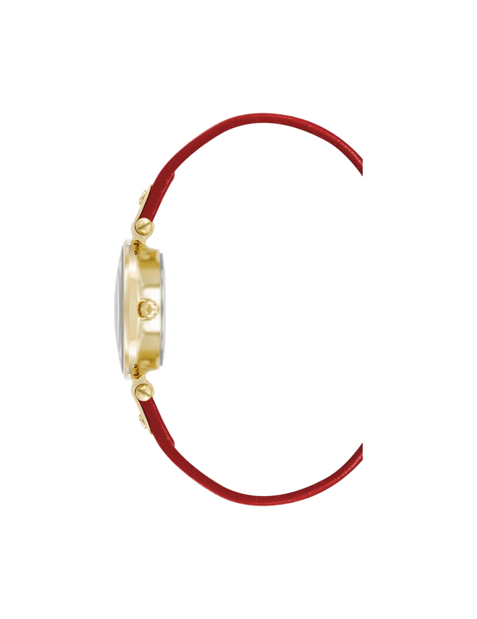 Женские кварцевые часы Anne Klein Consider It 5144WTRD представляют собой экологичный аксессуар с круглым корпусом диаметром 26 мм из металла с золотистым покрытием. Модель оснащена кварцевым механизмом японского производства с точностью хода ±20 секунд в месяц и белым циферблатом с золотистыми стрелками, черной минутной шкалой и индексами. Защитное минеральное стекло слегка выпуклой формы устойчиво к царапинам, а водонепроницаемость 30 метров обеспечивает защиту от брызг. Ремешок из экологичной кожи красного цвета с узором "змеиная кожа" изготовлен по стандартам Leather Working Group, что подтверждает ответственное производство с минимальным воздействием на окружающую среду. Уникальное сочетание золотистого циферблата и зеленого ремешка создает стильный контраст, подчеркивающий приверженность бренда устойчивой моде.