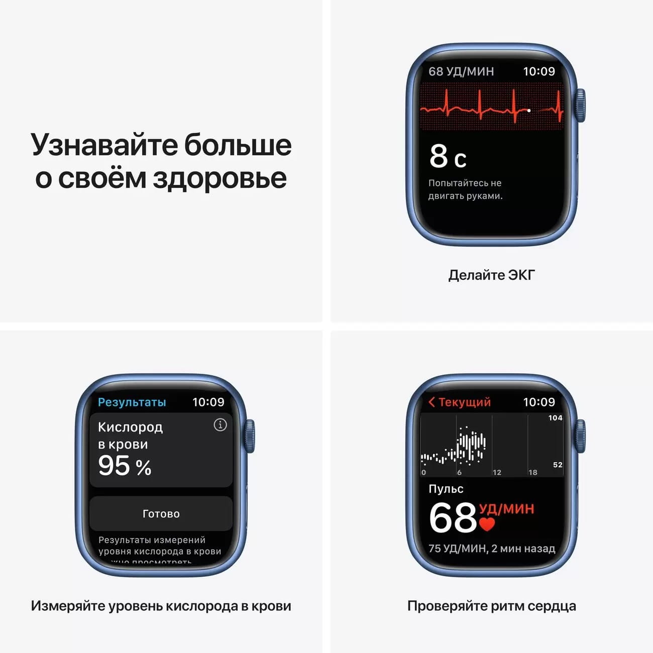 Умные часы Apple Watch Series 7 45mm Aluminum Case with Sport Band (MKN83), электронный механизм с высокой точностью. Класс водозащиты: 50 метров, позволит защитить корпус от случайных брызг или капель дождя. Корпус часов изготовлен из алюминия, синего цвета.