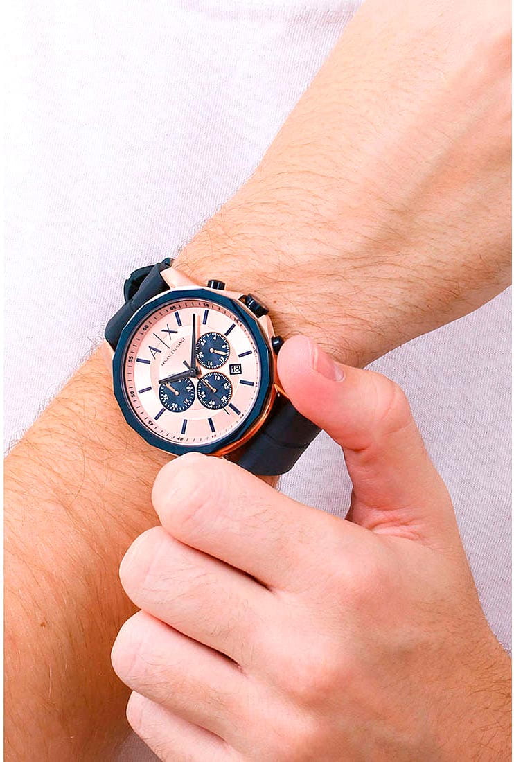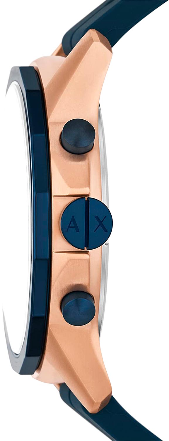 Мужские наручные часы-хронографХронографФункция позволяет измерять отрезки времени с особой точностью: часы, минуты, секунды. Верным признаком хронографа является наличие на циферблате 3 дополнительных окошек-счётчиков. с секундомеромСекундомерСекундоме́р — прибор, способный измерять интервалы времени с точностью до долей секунды. Armani Exchange AX1730, кварцевый механизм с высокой точностью. Класс водозащиты: 50 метров, позволит защитить корпус от случайных брызг или капель дождя. Корпус часов изготовлен из стали с IP-покрытиемIP-покрытиеМетод ионного напыления. Демонстрирует повышенную устойчивость к истиранию, окислению и химическим веществам. Под воздействием высокого давления и температуры около 1500°C молекулы металла надёжно соединяются с частицами корпуса часов..