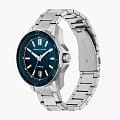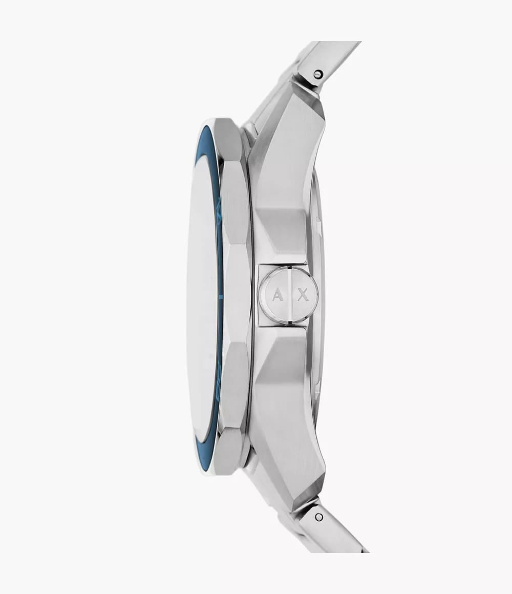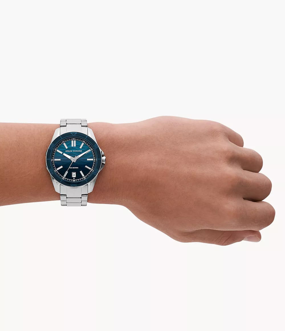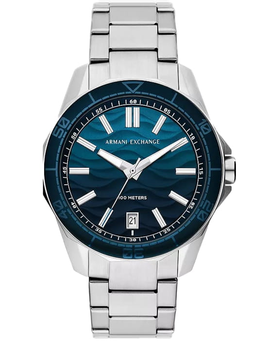 Мужские наручные часы с минеральным стекломМинеральное стеклоМинеральное стекло представляет собой искусственно выращенный минерал кварца. Такое стекло отличается особой устойчивостью к повреждениям и царапинам. Уступает по некоторым качествам сапфировому стеклу. Armani Exchange Dante AX1950, кварцевый механизм с высокой точностью. Класс водозащиты: 100 метров, позволит плавать, нырять и заниматься другими водными видами спорта. Корпус часов изготовлен из стали. Стальной браслет на раскладной застёжкеРаскладная застёжкаТакой тип застёжки используется только на браслетах из металла. Она никогда не раскрывается полностью, происходит разделение на 2 и более частей. Раскладывающая застёжка снизит вероятность потери часов к минимуму.. Вращающийся  безельБезельВнешний ободок, закрепляющий стекло. В спортивных часах так называется поворотное кольцо с делениями на циферблате, выполняет роль таймера – замеряет отрезки времени на шкале. Неподвижный безель – элемент декора. Однонаправленно вращающийся безель на дайверских часах позволяет фиксировать моменты погружения и выныривания на поверхность. с IP-покрытиемIP-покрытиеМетод ионного напыления. Демонстрирует повышенную устойчивость к истиранию, окислению и химическим веществам. Под воздействием высокого давления и температуры около 1500°C молекулы металла надёжно соединяются с частицами корпуса часов.. Текстурированный циферблат с метками в виде штрихов. Окошко даты находится в положении 6 часов.