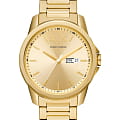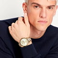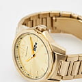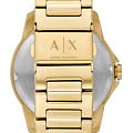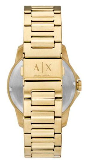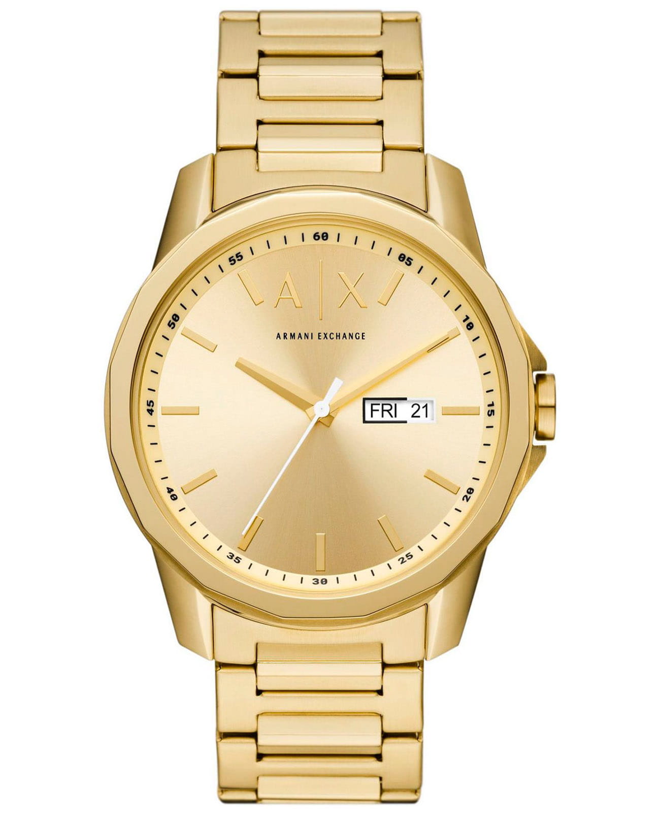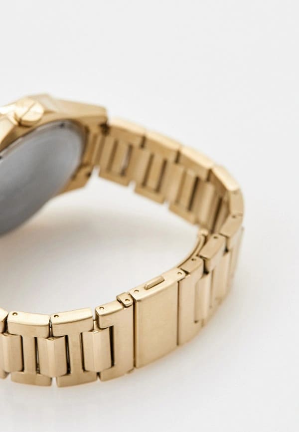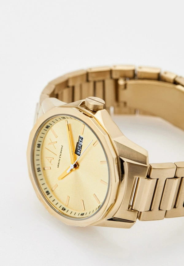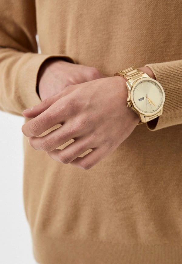 Мужские наручные часы с минеральным стекломМинеральное стеклоМинеральное стекло представляет собой искусственно выращенный минерал кварца. Такое стекло отличается особой устойчивостью к повреждениям и царапинам. Уступает по некоторым качествам сапфировому стеклу. Armani Exchange Banks AX1734, кварцевый механизм с высокой точностью. Класс водозащиты: 50 метров, позволит защитить корпус от случайных брызг или капель дождя. Корпус и браслет часов изготовлены из стали с IP-покрытиемIP-покрытиеМетод ионного напыления. Демонстрирует повышенную устойчивость к истиранию, окислению и химическим веществам. Под воздействием высокого давления и температуры около 1500°C молекулы металла надёжно соединяются с частицами корпуса часов. цвета желтое золото. Окошко даты в положении 3 часа. Заводная головка с защитой. Браслет с раскладной застёжкойРаскладная застёжкаТакой тип застёжки используется только на браслетах из металла. Она никогда не раскрывается полностью, происходит разделение на 2 и более частей. Раскладывающая застёжка снизит вероятность потери часов к минимуму..