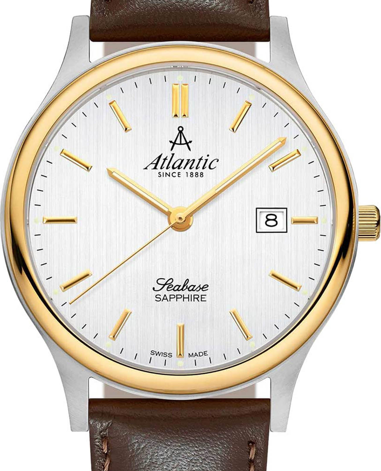 Мужские кварцевые швейцарские часы Atlantic Seapair 60343.43.21, механизм с высокой точностью. Циферблат часов с сапфировым стекломСапфировое стеклоПрочный и надёжный материал из кристалла сапфира синтетического происхождения, характеризующийся особой твёрдостью и устойчивостью к царапинам и повреждениям., устойчивым к появлению царапин и обладающее высокой прозрачностью. Класс водозащиты: 30 метров, позволит защитить корпус от случайных брызг или капель дождя. Корпус часов изготовлен из нержавеющей стали.Кожаный ремешок на стандартной застёжке. Окошко даты находится в положении 3 часа. БезельБезельВнешний ободок, закрепляющий стекло. В спортивных часах так называется поворотное кольцо с делениями на циферблате, выполняет роль таймера – замеряет отрезки времени на шкале. Неподвижный безель – элемент декора. Однонаправленно вращающийся безель на дайверских часах позволяет фиксировать моменты погружения и выныривания на поверхность. с PVD-покрытиемPVDУльтратонкое покрытие наносится в технике вакуумного напыления, сочетает в себе нитрид титана особой прочности со слоем золота или оксида хрома. Несёт в себе декоративную или защитную функцию..