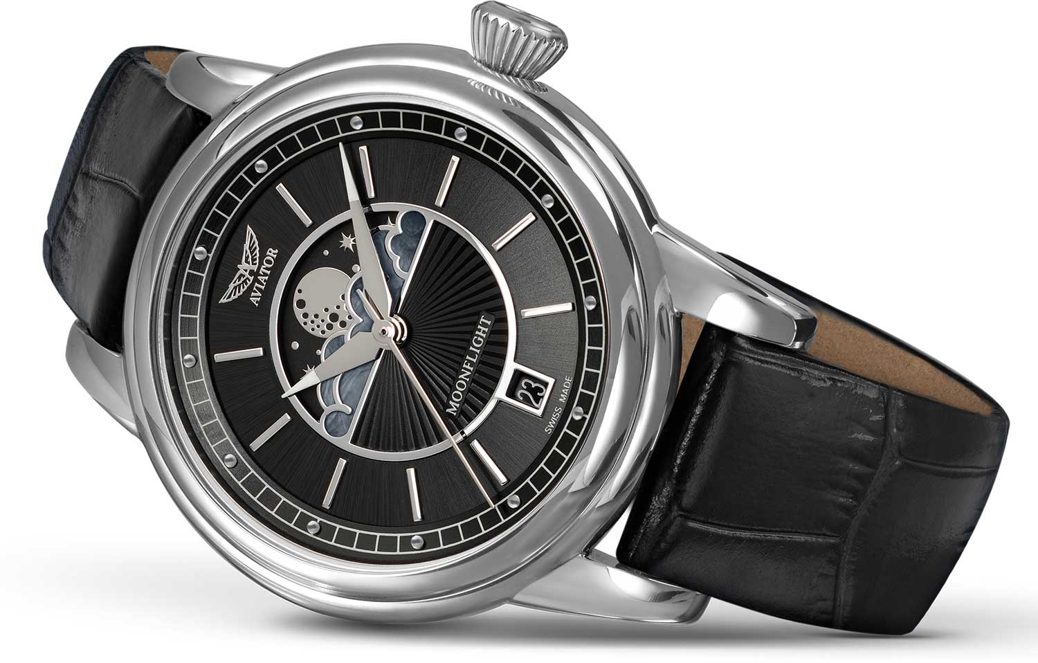 Aviator V.1.33.0.252.4 “Douglas Moonflight” — элегантный дамский швейцарский Moonphase с утончённой авиационной эстетикой. Корпус 36 мм из нержавеющей стали с полированной отделкой обладает компактными пропорциями и удобным литым профилем.