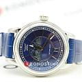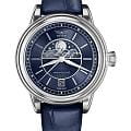 Циферблат в стиле Art Deco украшает усложнение фаз Луны в верхней половине, обрамлённой тонким кольцом облаков. Отмечено окно даты в положении «6 часов». Стрелки и накладные метки обработаны люминесцентным покрытиемЛюминесцентное покрытиеПозволяет считывать показания времени в темноте. Производители наносят на стрелки, часовые индексы, безель или поверхность циферблата светонакопительный состав, дающий холодное свечение. Superluminova — для уверенного считывания в темноте. Поверхность защищена сапфировым стекломСапфировое стеклоПрочный и надёжный материал из кристалла сапфира синтетического происхождения, характеризующийся особой твёрдостью и устойчивостью к царапинам и повреждениям. с антибликовым покрытием.