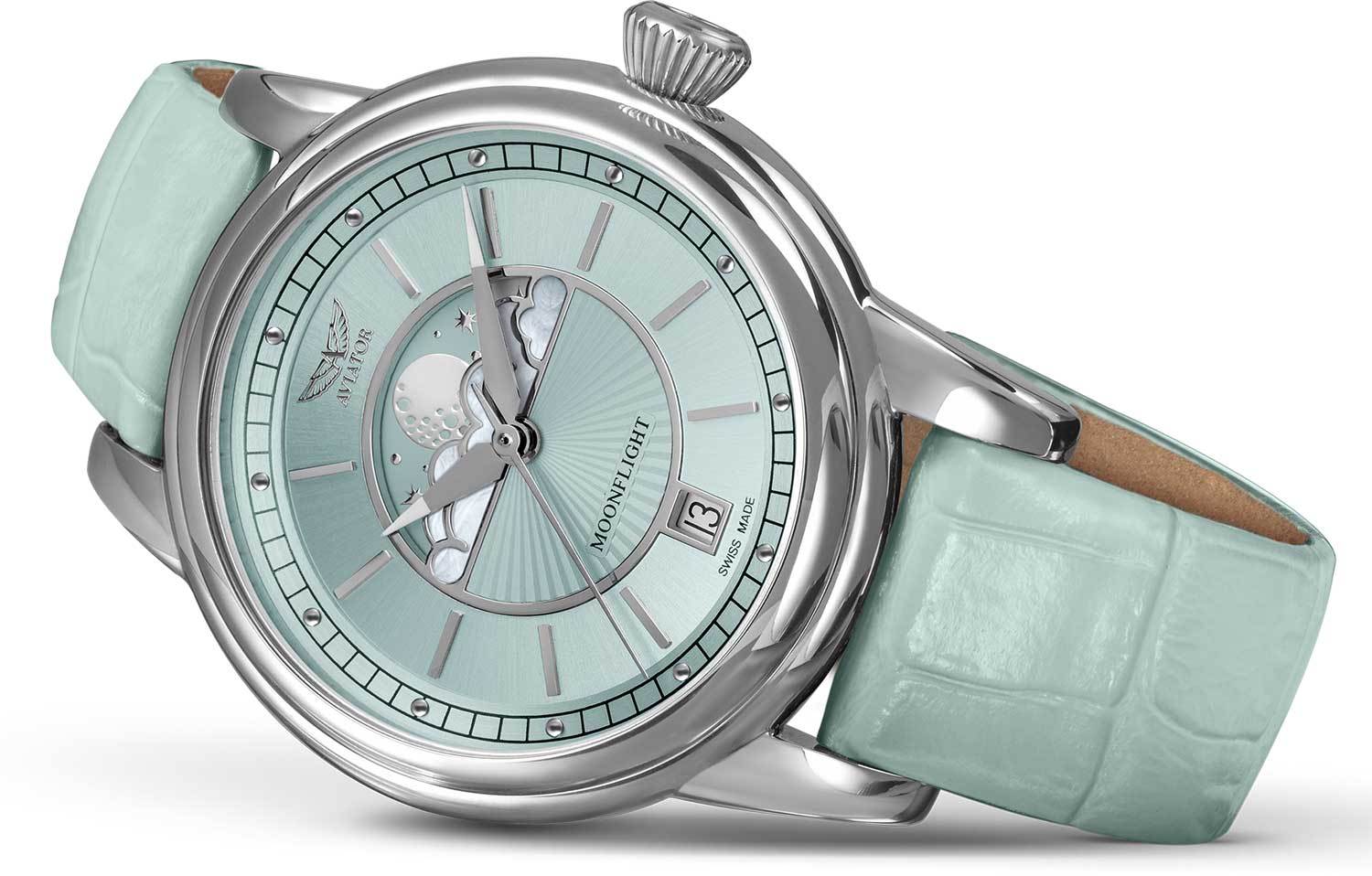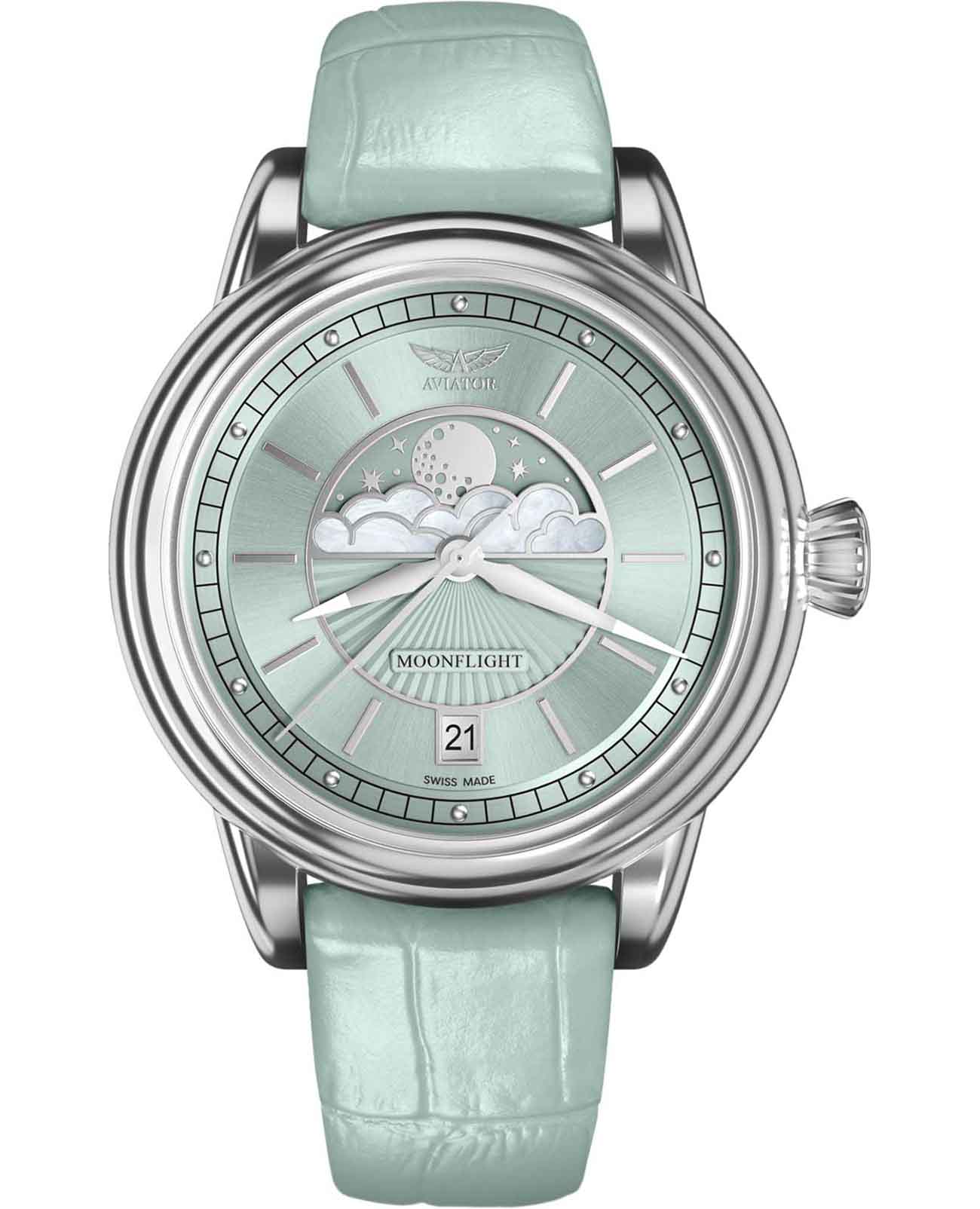Aviator V.1.33.0.261.4 “Douglas Moonflight” — элегантный дамский швейцарский Moonphase с утончённой авиационной эстетикой. Корпус 36 мм из нержавеющей стали с полированной отделкой обладает компактными пропорциями и удобным литым профилем.