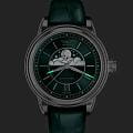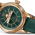 Циферблат в стиле Art Deco украшает усложнение фаз Луны в верхней половине, обрамлённой тонким кольцом облаков. Отмечено окно даты в положении «6 часов». Стрелки и накладные метки обработаны люминесцентным покрытиемЛюминесцентное покрытиеПозволяет считывать показания времени в темноте. Производители наносят на стрелки, часовые индексы, безель или поверхность циферблата светонакопительный состав, дающий холодное свечение. Superluminova — для уверенного считывания в темноте. Поверхность защищена сапфировым стекломСапфировое стеклоПрочный и надёжный материал из кристалла сапфира синтетического происхождения, характеризующийся особой твёрдостью и устойчивостью к царапинам и повреждениям. с антибликовым покрытием.