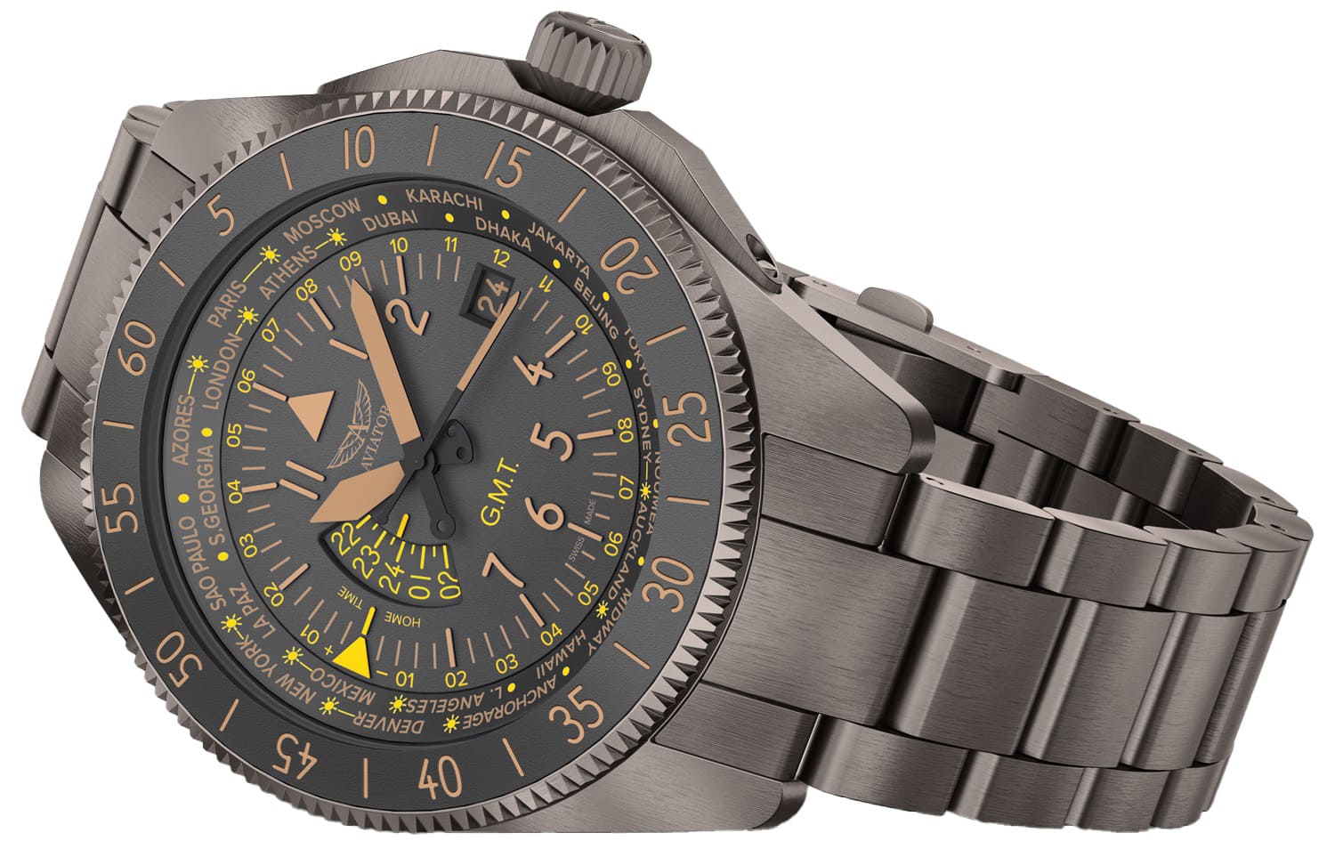 Airacobra GMT — инструментальное сочетание часовой точности, удобной функциональности GMT и авиационной эстетики, предназначенное для тех, кто ценит практичность и стиль в равной мере.