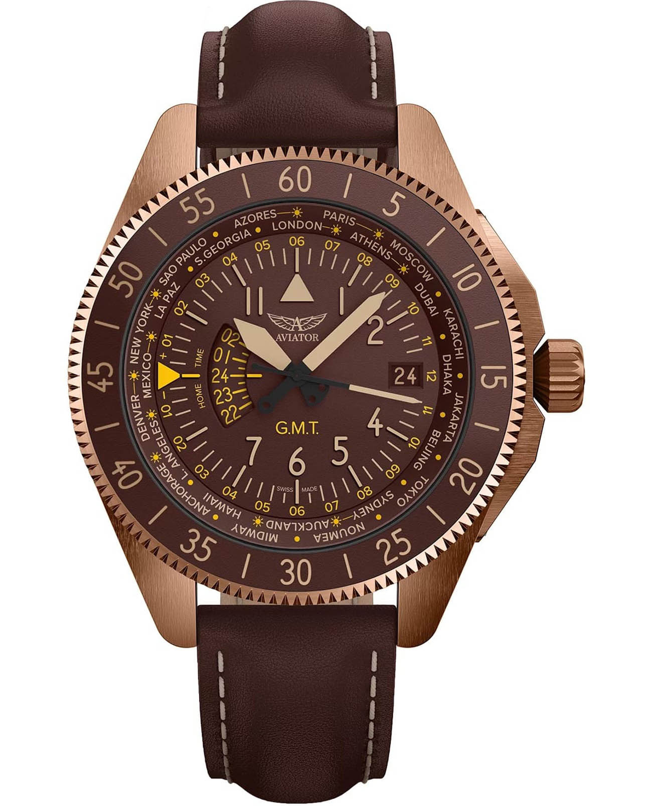 Aviator Airacobra GMT V.1.37.8.306.4 — сбалансированный швейцарский пилотский GMT, сочетающий техническую строгость с удобными функциями для путешествий. Корпус диаметром 42.8 мм и поворотный безельБезельВнешний ободок, закрепляющий стекло. В спортивных часах так называется поворотное кольцо с делениями на циферблате, выполняет роль таймера – замеряет отрезки времени на шкале. Неподвижный безель – элемент декора. Однонаправленно вращающийся безель на дайверских часах позволяет фиксировать моменты погружения и выныривания на поверхность. с керамической вставкой из нержавеющей стали 316 L с PVD-покрытиемPVDУльтратонкое покрытие наносится в технике вакуумного напыления, сочетает в себе нитрид титана особой прочности со слоем золота или оксида хрома. Несёт в себе декоративную или защитную функцию. обеспечивает уверенное ощущение надёжности, а герметичность до 100 м защищает при любой погоде. Циферблат отличается детальной функциональностью: в центре — крупные арабские цифры и стрелки, покрытые люминесцентным покрытиемЛюминесцентное покрытиеПозволяет считывать показания времени в темноте. Производители наносят на стрелки, часовые индексы, безель или поверхность циферблата светонакопительный состав, дающий холодное свечение. Superluminova, обеспечивающими мгновенное считывание времени даже в темноте. На «3 часах» — окошко даты, а индикатор второго часового пояса (GMT) удобно расположен на «9 часах». Безель с градусной шкалой для секунд — идеален для расчёта времени пути или времени прибытия. Циферблат защищён сапфировым стекломСапфировое стеклоПрочный и надёжный материал из кристалла сапфира синтетического происхождения, характеризующийся особой твёрдостью и устойчивостью к царапинам и повреждениям. с антибликовым покрытиемАнтибликовое покрытиеСлой оксида металла в 0,13-0,3 микрон, благодаря которому стекло часов не бликует и не отражает свет. Антибликовое покрытие уменьшает отражение света в 10 раз, обеспечивая отличную читаемость показателей циферблата., гарантирующим чёткий обзор без отражений. Кожаный ремень со стандартной застежкой сочетает в себе комфорт, элегантность и практичность. Airacobra GMT — инструментальное сочетание часовой точности, удобной функциональности GMT и авиационной эстетики, предназначенное для тех, кто ценит практичность и стиль в равной мере.