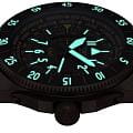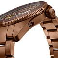 Циферблат отличается детальной функциональностью: в центре — крупные арабские цифры и стрелки, покрытые люминесцентным покрытиемЛюминесцентное покрытиеПозволяет считывать показания времени в темноте. Производители наносят на стрелки, часовые индексы, безель или поверхность циферблата светонакопительный состав, дающий холодное свечение., обеспечивающими мгновенное считывание времени даже в темноте. На «3 часах» — окошко даты, а индикатор второго часового пояса (GMT) удобно расположен на «9 часах». С внешней стороны — вращающийся безельБезельВнешний ободок, закрепляющий стекло. В спортивных часах так называется поворотное кольцо с делениями на циферблате, выполняет роль таймера – замеряет отрезки времени на шкале. Неподвижный безель – элемент декора. Однонаправленно вращающийся безель на дайверских часах позволяет фиксировать моменты погружения и выныривания на поверхность. с PVD-покрытиемPVDУльтратонкое покрытие наносится в технике вакуумного напыления, сочетает в себе нитрид титана особой прочности со слоем золота или оксида хрома. Несёт в себе декоративную или защитную функцию. с насечкой и градусной шкалой для секунд — идеален для расчёта времени пути или времени прибытия .