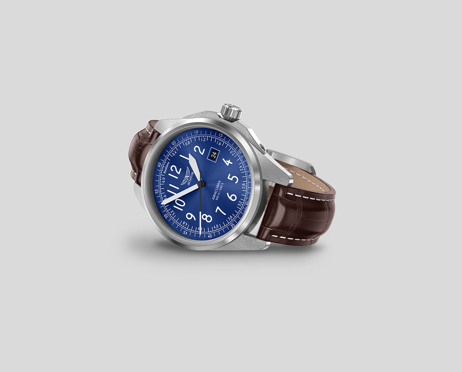 Aviator Airacobra 43 Type B V.1.38.0.325.4 — надёжные швейцарские пилотские часы с насыщенным функционалом и строгим авиационным дизайном. Корпус диаметром 42,8 мм выполнен из нержавеющей стали 316L. Циферблат имеет крупные арабские цифры и жёсткий контраст, соответствующий классическим пилотским образцам. Стрелки и метки покрыты люминесцентным покрытиемЛюминесцентное покрытиеПозволяет считывать показания времени в темноте. Производители наносят на стрелки, часовые индексы, безель или поверхность циферблата светонакопительный состав, дающий холодное свечение. Superluminova — это обеспечивает отличную читаемость в любых условиях. Окошко даты расположено у отметки «3 часа». На борту установлен швейцарский кварцевый механизм, способный с высокой точностью отображать время, дату. Циферблат защищён стойким сапфировым стекломСапфировое стеклоПрочный и надёжный материал из кристалла сапфира синтетического происхождения, характеризующийся особой твёрдостью и устойчивостью к царапинам и повреждениям. с антибликовым покрытиемАнтибликовое покрытиеСлой оксида металла в 0,13-0,3 микрон, благодаря которому стекло часов не бликует и не отражает свет. Антибликовое покрытие уменьшает отражение света в 10 раз, обеспечивая отличную читаемость показателей циферблата., завинчивающаяся заводная головка и задняя крышка обеспечивают уровень водозащиты до 100 метров. Кожаный ремень со стандартной застежкой обеспечивает удобство и надёжную фиксацию. Airacobra 43 Type B — инструментальные пилотские часы для тех, кто ценит надёжность, точность и удобную функциональность второго часового пояса в эстетике классических авиационных хронометров.