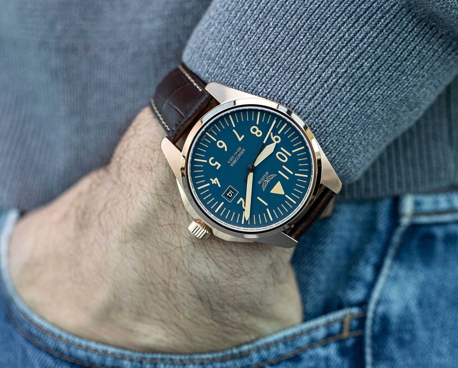 Aviator Airacobra 43 Type A V.1.38.2.318.4 — надёжные швейцарские пилотские часы с насыщенным функционалом и строгим авиационным дизайном. Корпус диаметром 42,8 мм выполнен из нержавеющей стали 316L с PVD-покрытиемPVDУльтратонкое покрытие наносится в технике вакуумного напыления, сочетает в себе нитрид титана особой прочности со слоем золота или оксида хрома. Несёт в себе декоративную или защитную функцию.. Циферблат имеет крупные арабские цифры и жёсткий контраст, соответствующий классическим пилотским образцам. Стрелки и метки покрыты люминесцентным покрытиемЛюминесцентное покрытиеПозволяет считывать показания времени в темноте. Производители наносят на стрелки, часовые индексы, безель или поверхность циферблата светонакопительный состав, дающий холодное свечение. Superluminova — это обеспечивает отличную читаемость в любых условиях. Окошко даты расположено у отметки «3 часа». На борту установлен швейцарский кварцевый механизм, способный с высокой точностью отображать время, дату. Циферблат защищён стойким сапфировым стекломСапфировое стеклоПрочный и надёжный материал из кристалла сапфира синтетического происхождения, характеризующийся особой твёрдостью и устойчивостью к царапинам и повреждениям. с антибликовым покрытиемАнтибликовое покрытиеСлой оксида металла в 0,13-0,3 микрон, благодаря которому стекло часов не бликует и не отражает свет. Антибликовое покрытие уменьшает отражение света в 10 раз, обеспечивая отличную читаемость показателей циферблата., завинчивающаяся заводная головка и задняя крышка обеспечивают уровень водозащиты до 100 метров. Кожаный ремень со стандартной застежкой обеспечивает удобство и надёжную фиксацию. Airacobra 43 Type A — инструментальные пилотские часы для тех, кто ценит надёжность, точность и удобную функциональность второго часового пояса в эстетике классических авиационных хронометров. Лимитированная серия.
