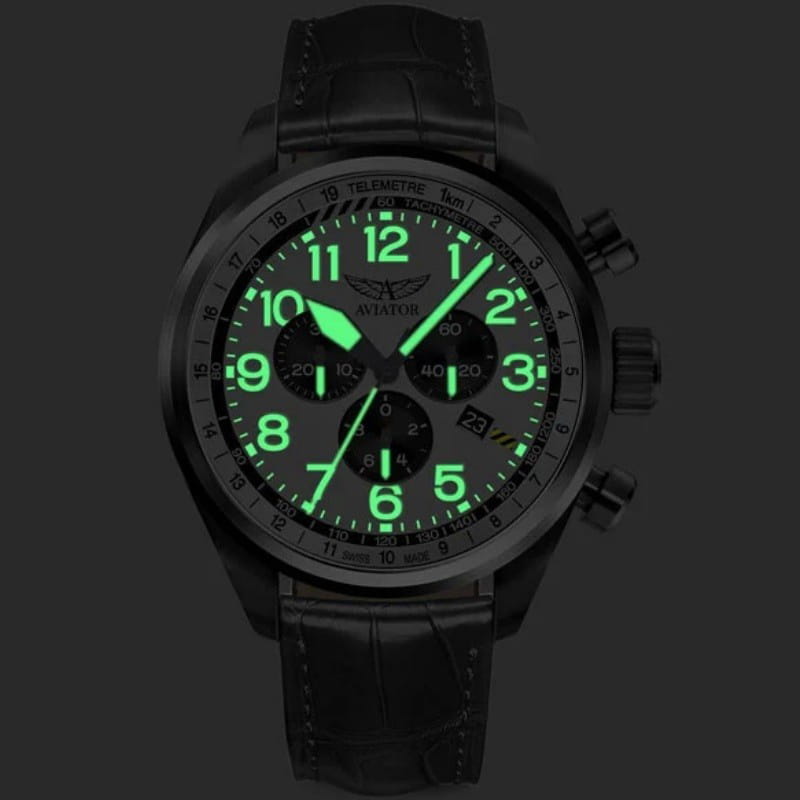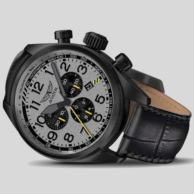 Aviator Airacobra P45 Chrono V.2.25.5.174.4 — швейцарские часы в духе пилотских инструментов, объединяющий точность, удобство и лаконичный дизайн. Диаметр корпуса — 45 мм, выполнен из нержавеющей стали 316L с PVD-покрытиемPVDУльтратонкое покрытие наносится в технике вакуумного напыления, сочетает в себе нитрид титана особой прочности со слоем золота или оксида хрома. Несёт в себе декоративную или защитную функцию., что подчёркивает техническую надёжность в образе часов. Циферблат оформлен в классическом aviator-стиле: крупные арабские цифры, широкие стрелки и чёткое деление минут позволяют считывать время мгновенно. Стрелки и метки покрыты люминесцентным покрытиемЛюминесцентное покрытиеПозволяет считывать показания времени в темноте. Производители наносят на стрелки, часовые индексы, безель или поверхность циферблата светонакопительный состав, дающий холодное свечение. Superluminova для отличной читаемости при слабом освещении. Циферблат защищён стойким сапфировым стекломСапфировое стеклоПрочный и надёжный материал из кристалла сапфира синтетического происхождения, характеризующийся особой твёрдостью и устойчивостью к царапинам и повреждениям. с антибликовым покрытиемАнтибликовое покрытиеСлой оксида металла в 0,13-0,3 микрон, благодаря которому стекло часов не бликует и не отражает свет. Антибликовое покрытие уменьшает отражение света в 10 раз, обеспечивая отличную читаемость показателей циферблата.. У модели присутствуют дата и точный откидной механизм завинчивающейся заводной головки и задней крышки, обеспечивающий надёжную водозащиту до 100 м и защиту от ударов. Внутри установлен швейцарский кварцевый механизм, который обеспечивает функции хронографаХронографФункция позволяет измерять отрезки времени с особой точностью: часы, минуты, секунды. Верным признаком хронографа является наличие на циферблате 3 дополнительных окошек-счётчиков.. Функции добавить (ADD) и разделить (SPLIT). Кожаный ремень со стандартной застежкой обеспечивает удобство и надёжную фиксацию. Эти изысканные часы так же обладают функциями тахиметраТахиметрРазмеченная шкала, располагается на ободке или безеле часов. Тахиметр позволяет рассчитать скорость на определённом участке пути, расстояние измеряется в километрах или милях., секундомераСекундомерСекундоме́р — прибор, способный измерять интервалы времени с точностью до долей секунды. и телеметра. Airacobra — это практичный и стильный инструмент для путешествий и активной повседневности, объединяющий авиационную эстетику, точный механизм и удобство.