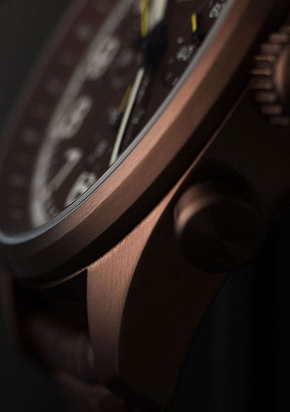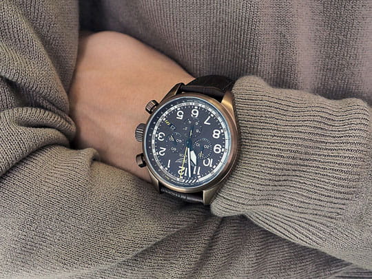 Aviator Airacobra P45 Chrono V.2.25.8.172.4 — швейцарские часы в духе пилотских инструментов, объединяющий точность, удобство и лаконичный дизайн. Диаметр корпуса — 45 мм, выполнен из нержавеющей стали 316L с PVD-покрытиемPVDУльтратонкое покрытие наносится в технике вакуумного напыления, сочетает в себе нитрид титана особой прочности со слоем золота или оксида хрома. Несёт в себе декоративную или защитную функцию., что подчёркивает техническую надёжность в образе часов. Циферблат оформлен в классическом aviator-стиле: крупные арабские цифры, широкие стрелки и чёткое деление минут позволяют считывать время мгновенно. Стрелки и метки покрыты люминесцентным покрытиемЛюминесцентное покрытиеПозволяет считывать показания времени в темноте. Производители наносят на стрелки, часовые индексы, безель или поверхность циферблата светонакопительный состав, дающий холодное свечение. Superluminova для отличной читаемости при слабом освещении. Циферблат защищён стойким сапфировым стекломСапфировое стеклоПрочный и надёжный материал из кристалла сапфира синтетического происхождения, характеризующийся особой твёрдостью и устойчивостью к царапинам и повреждениям. с антибликовым покрытиемАнтибликовое покрытиеСлой оксида металла в 0,13-0,3 микрон, благодаря которому стекло часов не бликует и не отражает свет. Антибликовое покрытие уменьшает отражение света в 10 раз, обеспечивая отличную читаемость показателей циферблата.. У модели присутствуют дата и точный откидной механизм завинчивающейся заводной головки и задней крышки, обеспечивающий надёжную водозащиту до 100 м и защиту от ударов. Внутри установлен швейцарский кварцевый механизм, который обеспечивает функции хронографаХронографФункция позволяет измерять отрезки времени с особой точностью: часы, минуты, секунды. Верным признаком хронографа является наличие на циферблате 3 дополнительных окошек-счётчиков.. Функции добавить (ADD) и разделить (SPLIT). Кожаный ремень со стандартной застежкой обеспечивает удобство и надёжную фиксацию. Эти изысканные часы так же обладают функциями тахиметраТахиметрРазмеченная шкала, располагается на ободке или безеле часов. Тахиметр позволяет рассчитать скорость на определённом участке пути, расстояние измеряется в километрах или милях., секундомераСекундомерСекундоме́р — прибор, способный измерять интервалы времени с точностью до долей секунды. и телеметра. Airacobra — это практичный и стильный инструмент для путешествий и активной повседневности, объединяющий авиационную эстетику, точный механизм и удобство.