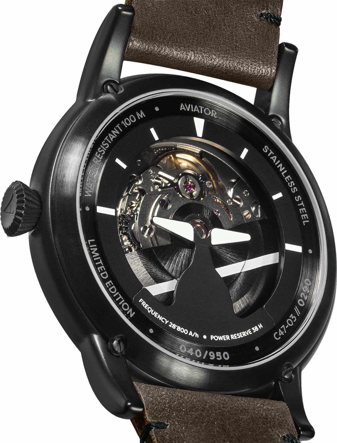 Aviator Douglas V.3.31.5.227.4 — швейцарские часы в классике авиадизайна, сочетающие безупречную читаемость и высокую надёжность. Лимитированная серия. Корпус диаметром 45 мм выполнен из нержавеющей стали с PVD-покрытиемPVDУльтратонкое покрытие наносится в технике вакуумного напыления, сочетает в себе нитрид титана особой прочности со слоем золота или оксида хрома. Несёт в себе декоративную или защитную функцию. черного цвета. Накладные метки выполнены в виде арабских цифр. Часовые метки и стрелки покрыты люминесцентным покрытиемЛюминесцентное покрытиеПозволяет считывать показания времени в темноте. Производители наносят на стрелки, часовые индексы, безель или поверхность циферблата светонакопительный состав, дающий холодное свечение. Superluminova, позволяющим легко определять время даже в тёмное время суток. Поверхность защищена прочным сапфировым стекломСапфировое стеклоПрочный и надёжный материал из кристалла сапфира синтетического происхождения, характеризующийся особой твёрдостью и устойчивостью к царапинам и повреждениям. с антибликовым покрытием, устойчивым к царапинам. Сердце модели — швейцарский механизм Sellita SW 200, известный своей точностью и долговечностью. Калибр управляется регулятором Etachron, который обеспечивает высокую точность хода как на земле, так и над землей. Водозащита 100 метров, позволит плавать, нырять и заниматься другими водными видами спорта. Завинчивающаяся головка и задняя крышка обеспечивают уверенную ударопрочностьУдаропрочный корпусМеханизм заключён в корпус, выполненный из современных материалов, устойчивых к ударам, механическим повреждениям и падению с высоты: инновационный пластик, карбон, нержавеющая сталь, титан. и надёжную защиту от влаги и пыли. В механизме 26 камней, запас хода 38 часов. Модель дополнена кожаным ремешком с выразительной текстурой и классическим стилем, закреплённым с помощью классической застежки — для максимального комфорта и лёгкости в повседневном использовании. Прозрачная задняя крышка украшена имитацией функции контроля управления хвоста самолета. Ротор механизма указывает на градусы, как в авиационном приборе триммер. Aviator — это образец лётной точности, инженерной чёткости и сдержанной роскоши, идеально подходящий для тех, кто ценит функциональность и уверенность в каждом элементе