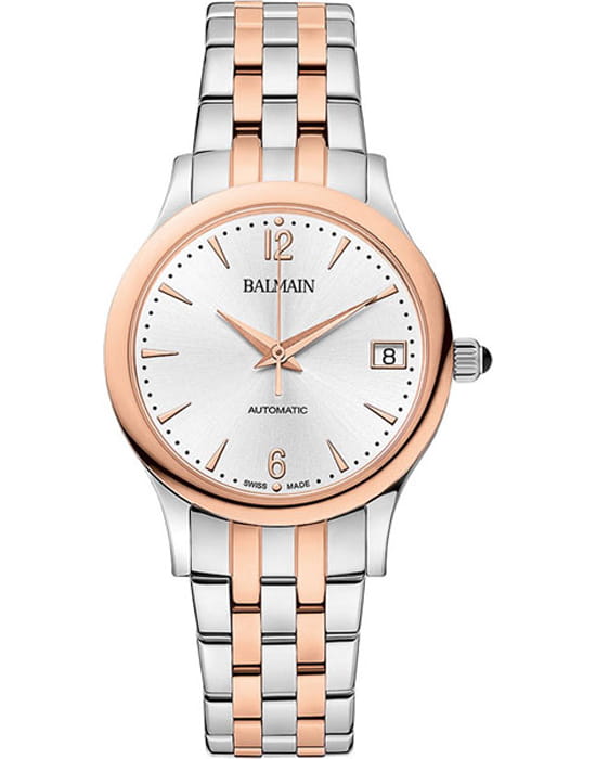 Женские часы Balmain Classic R Automatic B3998.33.24 механизм с высокой точностью. Сапфировое стеклоСапфировое стеклоПрочный и надёжный материал из кристалла сапфира синтетического происхождения, характеризующийся особой твёрдостью и устойчивостью к царапинам и повреждениям. устойчивое к появлению царапин, обладающее высокой прозрачностью. Корпус изготовлен из нержавеющей стали. Класс водозащиты: 50 метров, позволит защитить корпус от случайных брызг или капель дождя. Стальной браслет с PVD-покрытиемPVDУльтратонкое покрытие наносится в технике вакуумного напыления, сочетает в себе нитрид титана особой прочности со слоем золота или оксида хрома. Несёт в себе декоративную или защитную функцию. на застёжке «бабочка» с кнопкамиЗастёжка "бабочка"Такой вид застёжки дополняется предохранителями, помогающими избежать случайного раскрытия браслета. Обладают изящным исполнением. . БезельБезельВнешний ободок, закрепляющий стекло. В спортивных часах так называется поворотное кольцо с делениями на циферблате, выполняет роль таймера – замеряет отрезки времени на шкале. Неподвижный безель – элемент декора. Однонаправленно вращающийся безель на дайверских часах позволяет фиксировать моменты погружения и выныривания на поверхность. с PVD-покрытиемPVDУльтратонкое покрытие наносится в технике вакуумного напыления, сочетает в себе нитрид титана особой прочности со слоем золота или оксида хрома. Несёт в себе декоративную или защитную функцию.. Дата в положении 3 часа.