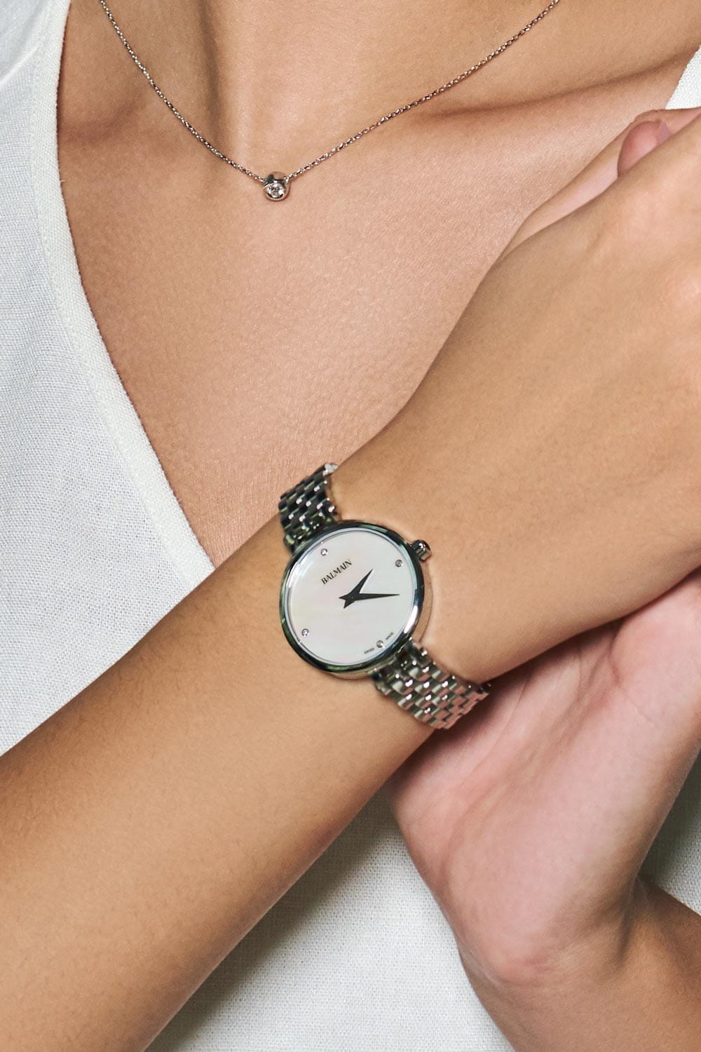 Женские часы Balmain Sedirea B4291.33.85 кварцевый механизм с высокой точностью. Сапфировое стеклоСапфировое стеклоПрочный и надёжный материал из кристалла сапфира синтетического происхождения, характеризующийся особой твёрдостью и устойчивостью к царапинам и повреждениям. устойчивое к появлению царапин, обладающее высокой прозрачностью. Корпус изготовлен из нержавеющей стали. Класс водозащиты: 50 метров, позволит защитить корпус от случайных брызг или капель дождя. Стальной браслет на застёжке «бабочка» с кнопкамиЗастёжка "бабочка"Такой вид застёжки дополняется предохранителями, помогающими избежать случайного раскрытия браслета. Обладают изящным исполнением. .