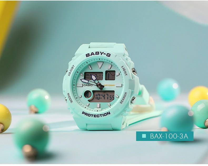 Женские японские часы Casio Baby-G G-Lide BAX-100-3AER c хронографомХронографФункция позволяет измерять отрезки времени с особой точностью: часы, минуты, секунды. Верным признаком хронографа является наличие на циферблате 3 дополнительных окошек-счётчиков. из коллекции Baby-G выпущены специально для любительниц сёрфинга и больших волн.
