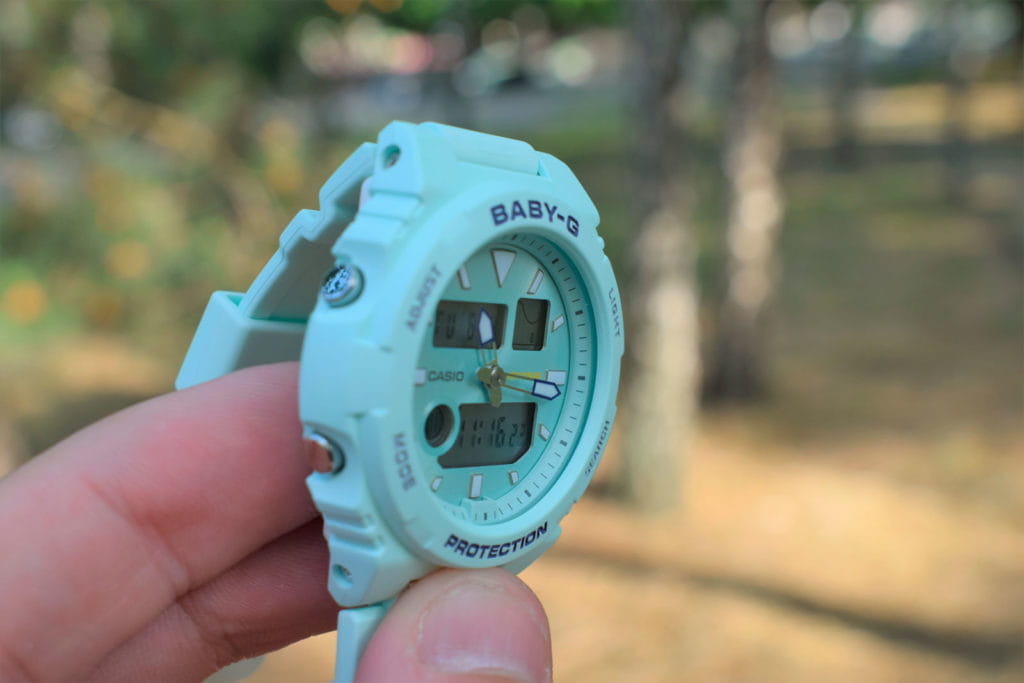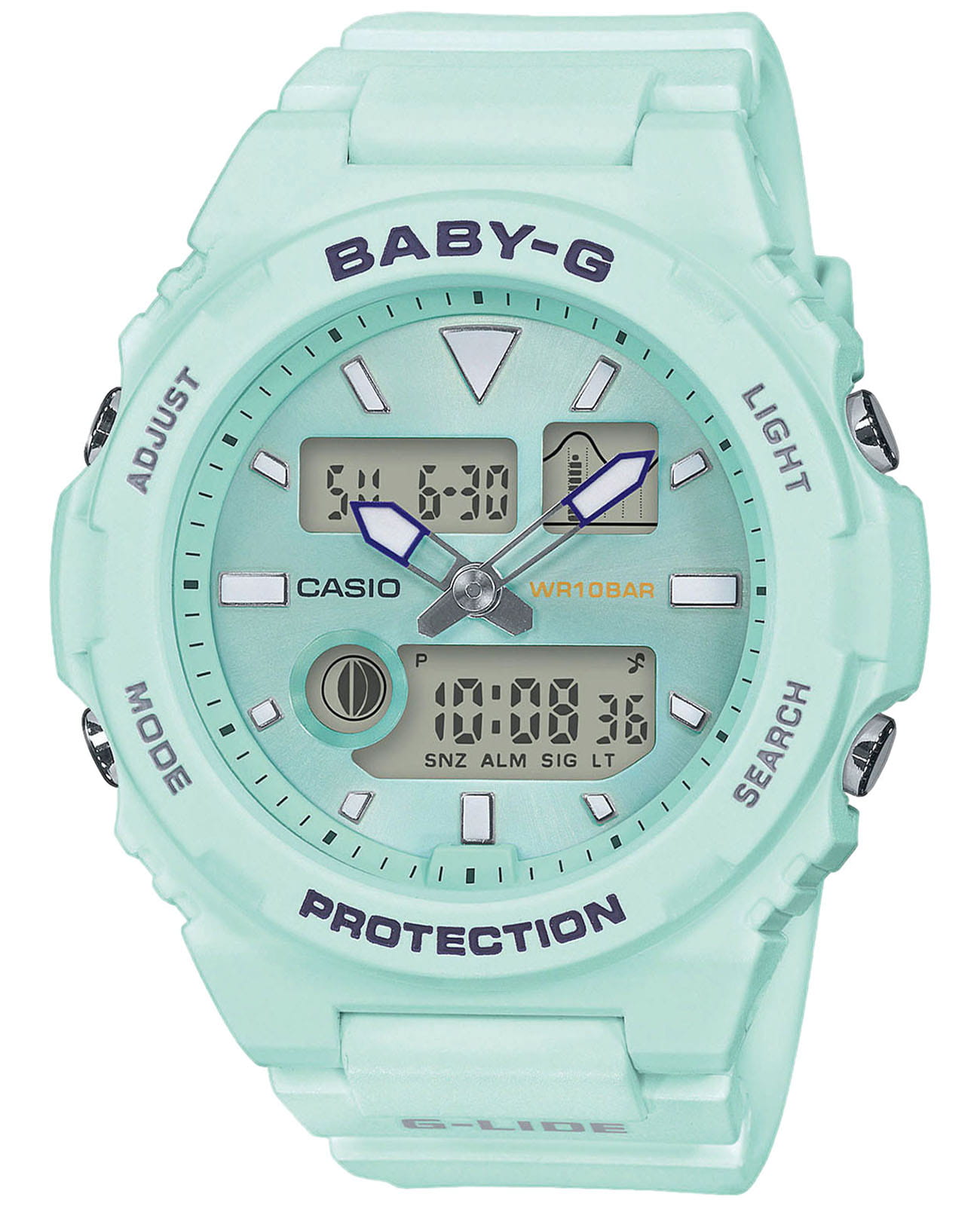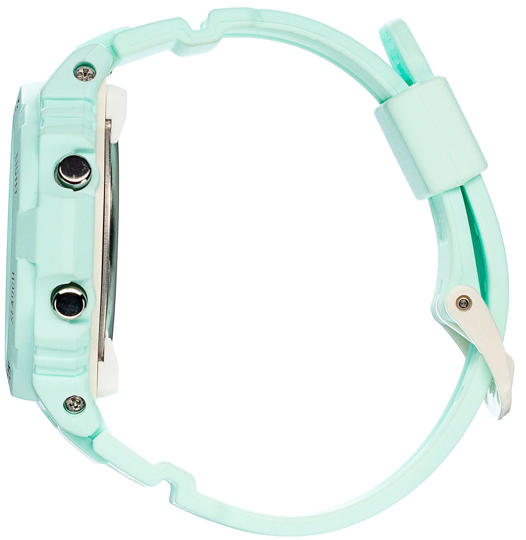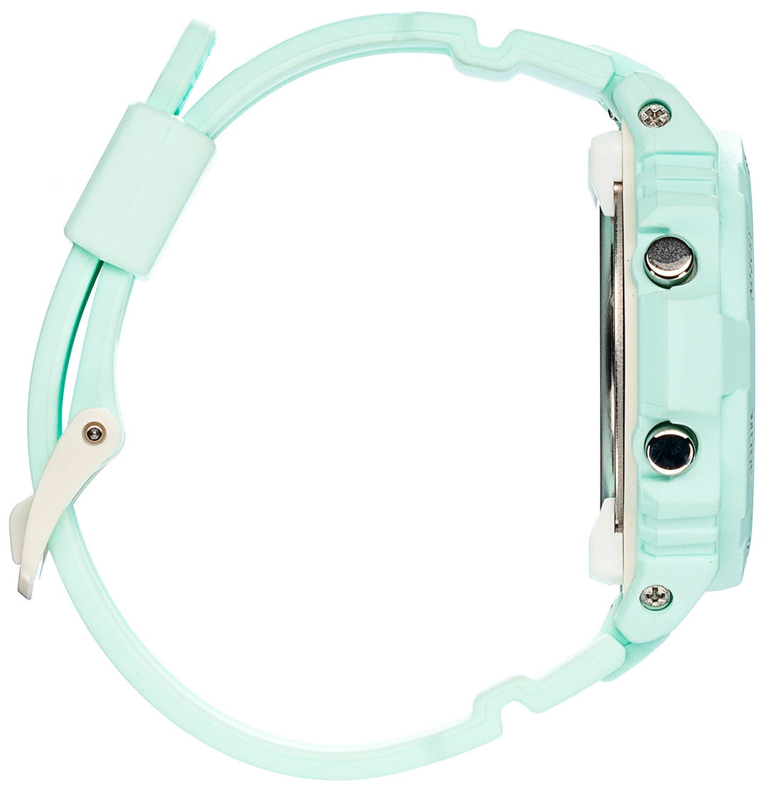 Аксессуар серии G-Lide отражает стиль 90-х годов, привлекательно смотрятся контрастные элементы оформления на фоне мятного оттенка. Это идеальный вариант для дополнения спортивного или повседневного образа. Противоударный корпусУдаропрочный корпусМеханизм заключён в корпус, выполненный из современных материалов, устойчивых к ударам, механическим повреждениям и падению с высоты: инновационный пластик, карбон, нержавеющая сталь, титан. из полимерного материала защищает «начинку» часов от ударов, повреждений, падения. Японский кварцевый механизм с абсолютной точностью хода. Аккумулятор рассчитан на 3 года работы. Дополнительный циферблат мирового времениМировое время Полезное часовое усложнение, отображающее время в основных городах и известных областях по всему миру, оно связано с часовыми поясами, удобно для путешественников и бизнесменов. . Минеральное стеклоМинеральное стеклоМинеральное стекло представляет собой искусственно выращенный минерал кварца. Такое стекло отличается особой устойчивостью к повреждениям и царапинам. Уступает по некоторым качествам сапфировому стеклу. устойчивое к мелким механическим повреждениям. Водонепроницаемость 10 бар. Автоматическая светодиодная подсветкаСветодиодная подсветкаСветодиодная или LED-подсветка обеспечивает появление яркого холодного свечения за счёт LED-элементов - маленьких лампочек. Они потребляют минимальное количество энергии, чаще всего можно встретить 1 светодиод, в нижней части циферблата.. БудильникБудильникБуди́льник — часы, в заданный момент времени подающие звуковой, световой и/или в редких случаях другой сигнал. с функцией «подремать», автоматический календарь. Подсветка NeobriteПодсветка NeobriteИспользование светонакопительных составов на основе сульфида цинка или алюмината стронция, яркий свет можно наблюдать на протяжении 6-10 часов после «зарядки» часов около источника света. обеспечивает длительное послесвечение в темноте даже после кратковременного нахождения на свету. - при повороте часов в сторону лица подсветка дисплея осуществляется автоматически. Отображение возраста и фазы Луны. Отображение сведений о приливах и отливах на заданную дату и время даже в режиме хронометража. При каждом нажатии на кнопку напротив 4-х часов можно почасово отследить будущий уровень волны в определенном месте. СекундомерСекундомерСекундоме́р — прибор, способный измерять интервалы времени с точностью до долей секунды. с точностью показаний 1/100с и временем измерения 24ч. Сплит-хронографСплит-хронографИспользуется для измерения продолжительности нескольких временных отрезков, начинающихся одновременно, а заканчивающихся в разное время.. ТаймерТаймерОтсчитывает секунды в обратном направлении в заданном интервале времени. обратного отсчета от 1/1сек до 24ч с автоповтором. 12-ти и 24-х часовой формат времени. Типы сигналов: ежедневный, ежемесячный, каждый день определенного месяца, на определенную дату. Функция отключения/включения звука. Габариты: 46,1 x 42,4 x 12,3 мм.