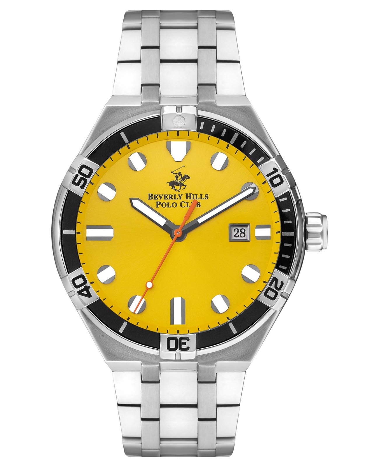 Американские мужские часы Beverly Hills Polo Club BP3404X.380 с минеральным стекломМинеральное стеклоМинеральное стекло представляет собой искусственно выращенный минерал кварца. Такое стекло отличается особой устойчивостью к повреждениям и царапинам. Уступает по некоторым качествам сапфировому стеклу., кварцевый механизм с высокой точностью. Корпус и браслет часов изготовлен из нержавеющей стали. Стрелки с люминесцентной подсветкойЛюминесцентное покрытиеПозволяет считывать показания времени в темноте. Производители наносят на стрелки, часовые индексы, безель или поверхность циферблата светонакопительный состав, дающий холодное свечение.. Окошко даты в положении 3 часов. Класс водозащиты: 100 метров, позволит плавать, нырять и заниматься другими водными видами спорта. Стальной браслет на раскладной застёжкеРаскладная застёжкаТакой тип застёжки используется только на браслетах из металла. Она никогда не раскрывается полностью, происходит разделение на 2 и более частей. Раскладывающая застёжка снизит вероятность потери часов к минимуму..