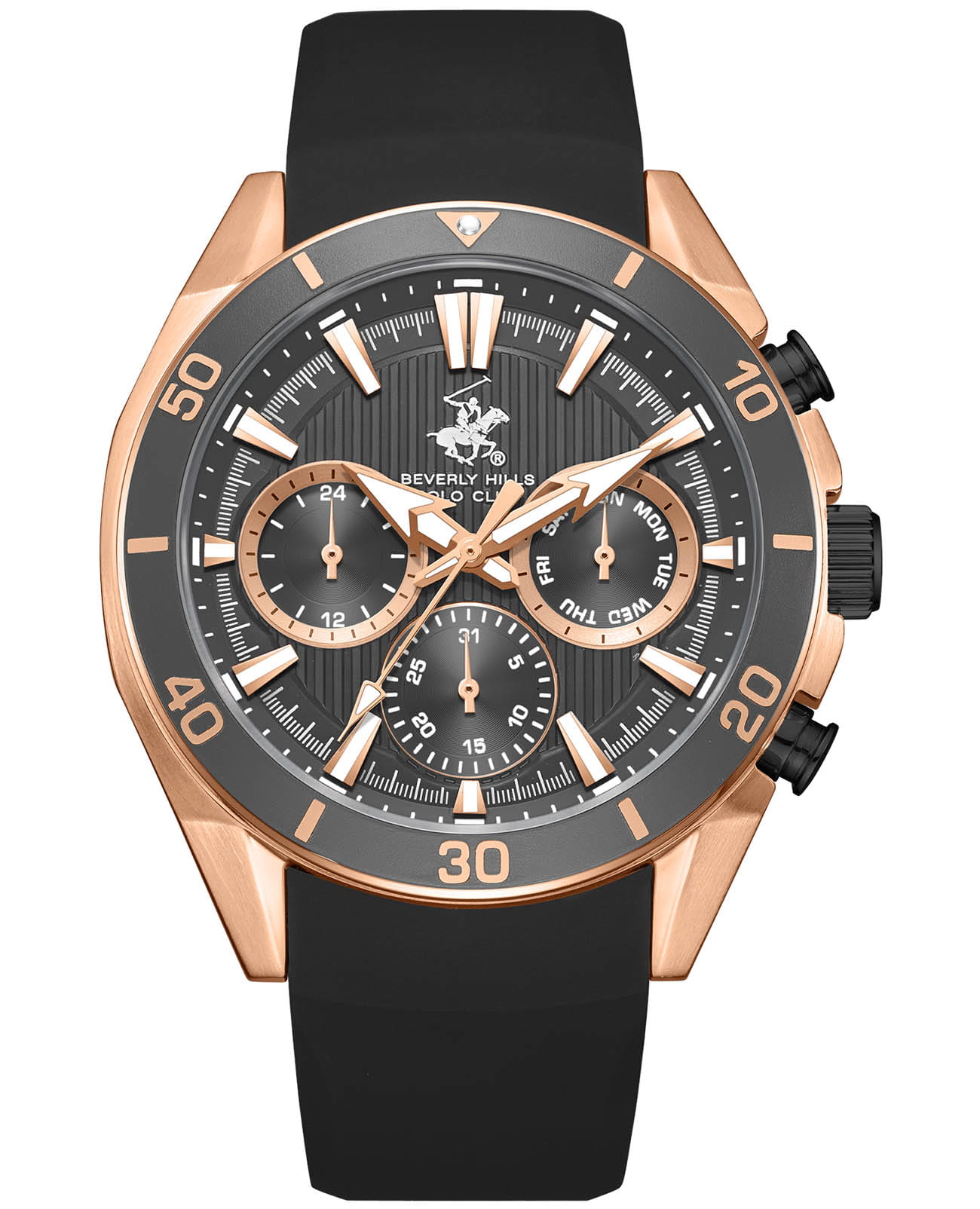 На циферблате отображается не только текущее время, но и такие полезные функции, как дата, день недели, 24-часовой формат. Эта модель — истинное воплощение философии Beverly Hills Polo Club: сочетание высоких стандартов качества и неподражаемого стиля, создающее аксессуар, который станет вашим верным компаньоном в повседневной жизни. БезельБезельВнешний ободок, закрепляющий стекло. В спортивных часах так называется поворотное кольцо с делениями на циферблате, выполняет роль таймера – замеряет отрезки времени на шкале. Неподвижный безель – элемент декора. Однонаправленно вращающийся безель на дайверских часах позволяет фиксировать моменты погружения и выныривания на поверхность. с IP-покрытиемIP-покрытиеМетод ионного напыления. Демонстрирует повышенную устойчивость к истиранию, окислению и химическим веществам. Под воздействием высокого давления и температуры около 1500°C молекулы металла надёжно соединяются с частицами корпуса часов..