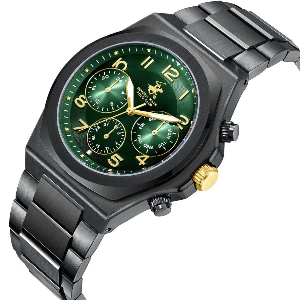 Американские мужские часы Beverly Hills Polo Club BP3777X.670 - это стильный мужской аксессуар, который сочетает элегантный дизайн и практичность. Корпус выполнен из нержавеющей стали с IP-покрытиемIP-покрытиеМетод ионного напыления. Демонстрирует повышенную устойчивость к истиранию, окислению и химическим веществам. Под воздействием высокого давления и температуры около 1500°C молекулы металла надёжно соединяются с частицами корпуса часов. черного цвета, диаметром 42 мм, что обеспечивает долговечность и утончённый внешний вид. Надежное минеральное стеклоМинеральное стеклоМинеральное стекло представляет собой искусственно выращенный минерал кварца. Такое стекло отличается особой устойчивостью к повреждениям и царапинам. Уступает по некоторым качествам сапфировому стеклу. с сапфировым покрытием защищает циферблат от царапин и обеспечивает долговечность. Модель оснащена кварцевым механизмом, обеспечивающим высокую точность хода. Стальной браслет с IP-покрытиемIP-покрытиеМетод ионного напыления. Демонстрирует повышенную устойчивость к истиранию, окислению и химическим веществам. Под воздействием высокого давления и температуры около 1500°C молекулы металла надёжно соединяются с частицами корпуса часов. на раскладной застёжкеРаскладная застёжкаТакой тип застёжки используется только на браслетах из металла. Она никогда не раскрывается полностью, происходит разделение на 2 и более частей. Раскладывающая застёжка снизит вероятность потери часов к минимуму. обеспечивает комфортное ношение. Функциональность модели расширена за счёт индикации дня недели, с дополнительным 24-х часовым индикатором. Стрелки с люминесцентным покрытиемЛюминесцентное покрытиеПозволяет считывать показания времени в темноте. Производители наносят на стрелки, часовые индексы, безель или поверхность циферблата светонакопительный состав, дающий холодное свечение. позволяют легко считывать время даже в условиях недостаточного освещения. Водозащита 50 метров позволит защитить корпус от случайных брызг или капель дождя. Эта модель – отличный выбор для тех, кто ищет сочетание стиля, качества и функциональности. Часы станут не только полезным аксессуаром, но и выразительным элементом вашего имиджа.