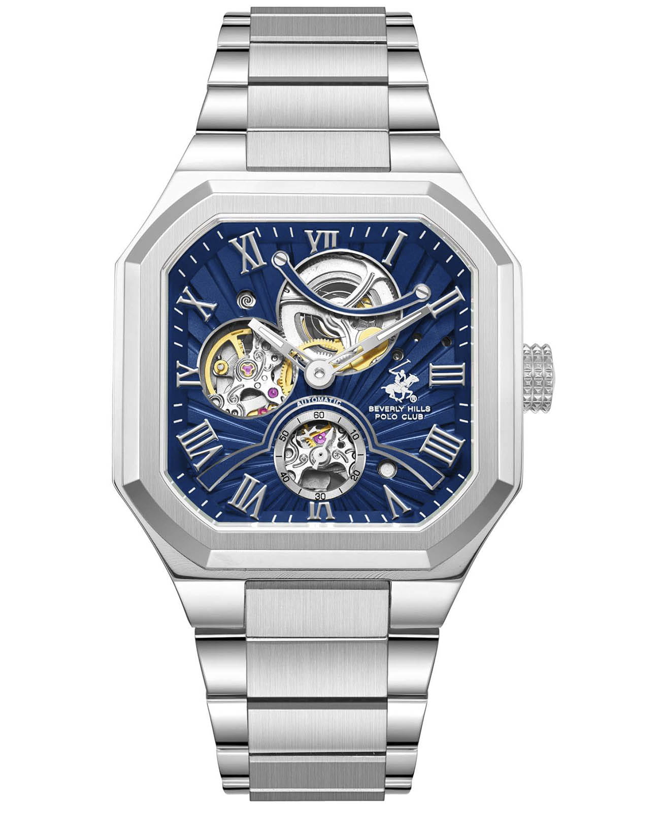 Мужские механические часы с автоподзаводом Beverly Hills Polo Club — это идеальное сочетание силы, стиля и современных технологий. Корпус диаметром 40 мм выполнен из стали 316L и имеет форму квадрата со срезанными углами. Циферблат синего цвета частично скелетонизированный, оформлен римскими цифрами и стрелками. Секундная стрелка вынесена на отдельный субциферблат. Циферблат защищён минеральным стекломМинеральное стеклоМинеральное стекло представляет собой искусственно выращенный минерал кварца. Такое стекло отличается особой устойчивостью к повреждениям и царапинам. Уступает по некоторым качествам сапфировому стеклу. с сапфировым покрытием. Заводная головка завинчивающаяся, что повышает надёжность. Часы оснащены стальным браслетом на застёжке «бабочка» с кнопкамиЗастёжка "бабочка"Такой вид застёжки дополняется предохранителями, помогающими избежать случайного раскрытия браслета. Обладают изящным исполнением. . Водонепроницаемость 50 м позволяет использовать часы при мытье рук или в дождь. Идеальный выбор для тех, кто ценит американское качество и универсальный дизайн.