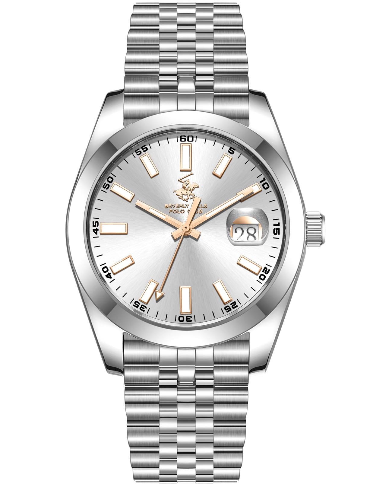 BEVERLY HILLS POLO CLUB BP3810X.330 — стильные мужские часы, сочетающие спортивную динамику и функциональность. Крупный корпус выполнен из нержавеющей стали серебристого цвета, диаметром 41 мм, гармонично дополнен стальным браслетом на застёжке-бабочке с кнопкамиЗастёжка "бабочка"Такой вид застёжки дополняется предохранителями, помогающими избежать случайного раскрытия браслета. Обладают изящным исполнением. . Циферблат с акцентными стрелками и метками с люминесцентным покрытиемЛюминесцентное покрытиеПозволяет считывать показания времени в темноте. Производители наносят на стрелки, часовые индексы, безель или поверхность циферблата светонакопительный состав, дающий холодное свечение. делает модель более практичной. Минеральное стеклоМинеральное стеклоМинеральное стекло представляет собой искусственно выращенный минерал кварца. Такое стекло отличается особой устойчивостью к повреждениям и царапинам. Уступает по некоторым качествам сапфировому стеклу. с сапфировым покрытием защищает циферблат от царапин, а кварцевый механизм обеспечивает высокую точность. Благодаря своей универсальной эстетике эти часы уместны и в деловой среде, и в повседневном образе. Окошко даты находится в положении 3 часа. Идеальный выбор для тех, кто ценит элегантный дизайн и качество. Водозащита до 50 метров позволит защитить корпус от случайных брызг или капель дождя.
