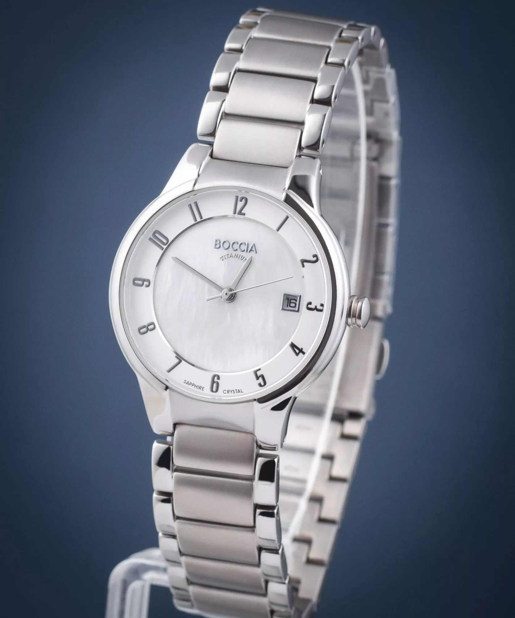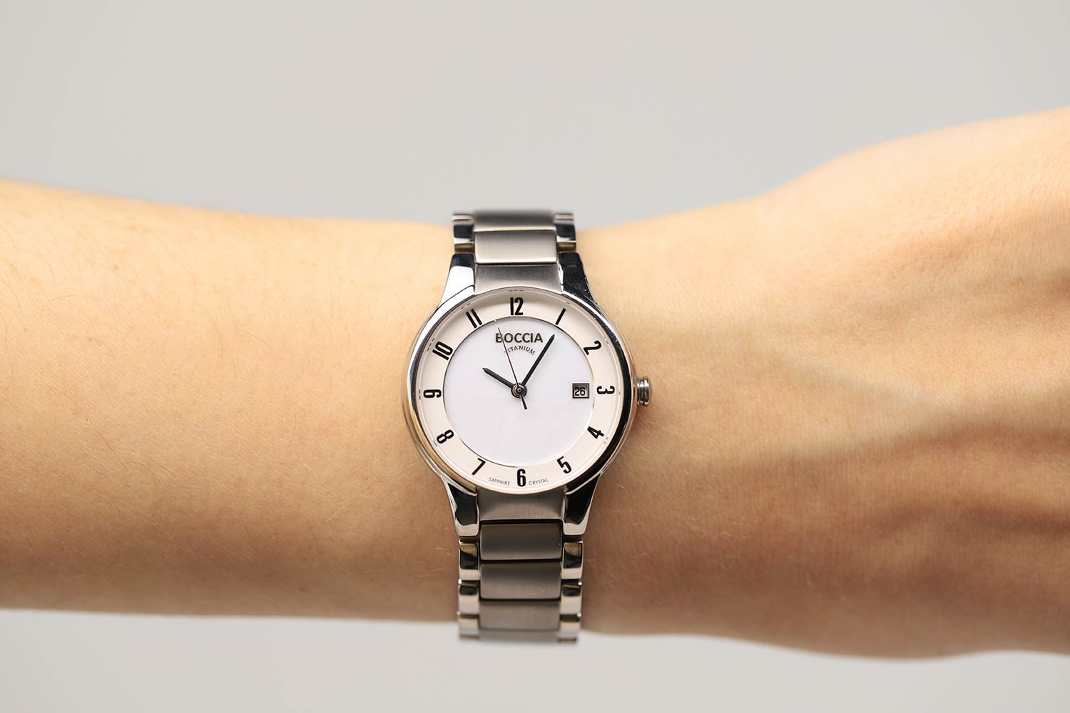 Женские немецкие титановые часы Boccia Titanium 3301-01 с надёжным кварцевым механизмом. Корпус изготовлен из титана диаметром 30мм подчеркивает современный дизайн модели. Сапфировое стеклоСапфировое стеклоПрочный и надёжный материал из кристалла сапфира синтетического происхождения, характеризующийся особой твёрдостью и устойчивостью к царапинам и повреждениям. устойчивое к мелким механическим повреждениям. Титановый браслет на раскладной застёжкеРаскладная застёжкаТакой тип застёжки используется только на браслетах из металла. Она никогда не раскрывается полностью, происходит разделение на 2 и более частей. Раскладывающая застёжка снизит вероятность потери часов к минимуму. обеспечивает комфортное ношение. Циферблат с метками в виде арабских цифр. Окошко даты в положении 3 часа. Класс водозащиты: 50 метров позволит защитить корпус от случайных брызг или капель дождя. Эти часы станут отличным выбором для тех, кто ценит стильный дизайн и функциональность в одном аксессуаре, подходят для ежедневного использования.