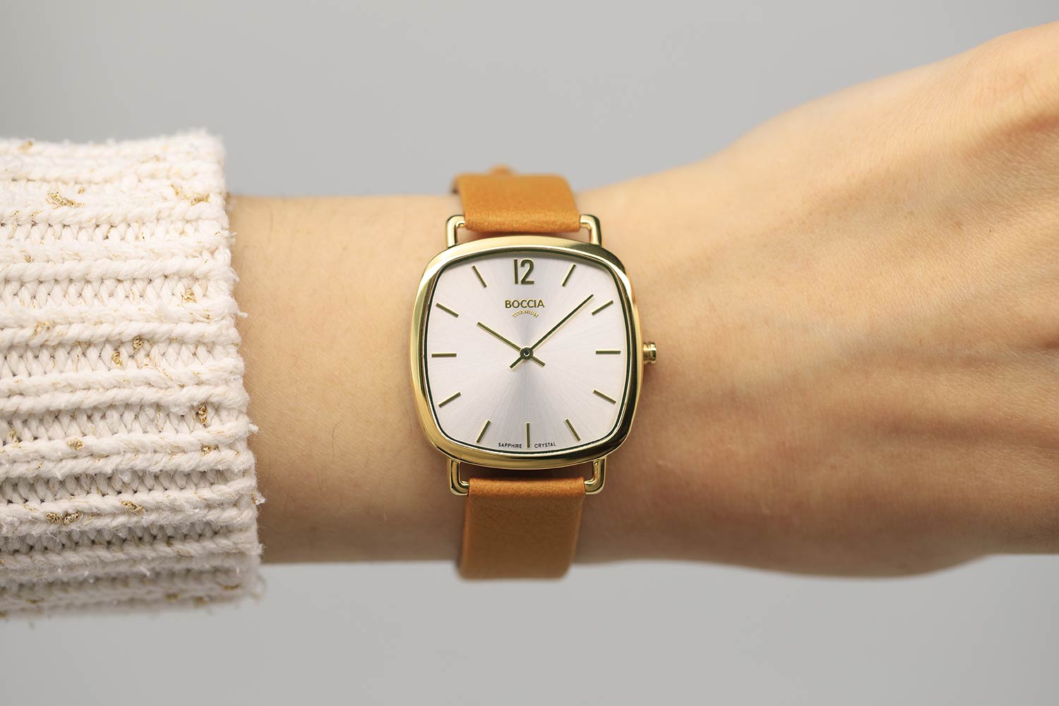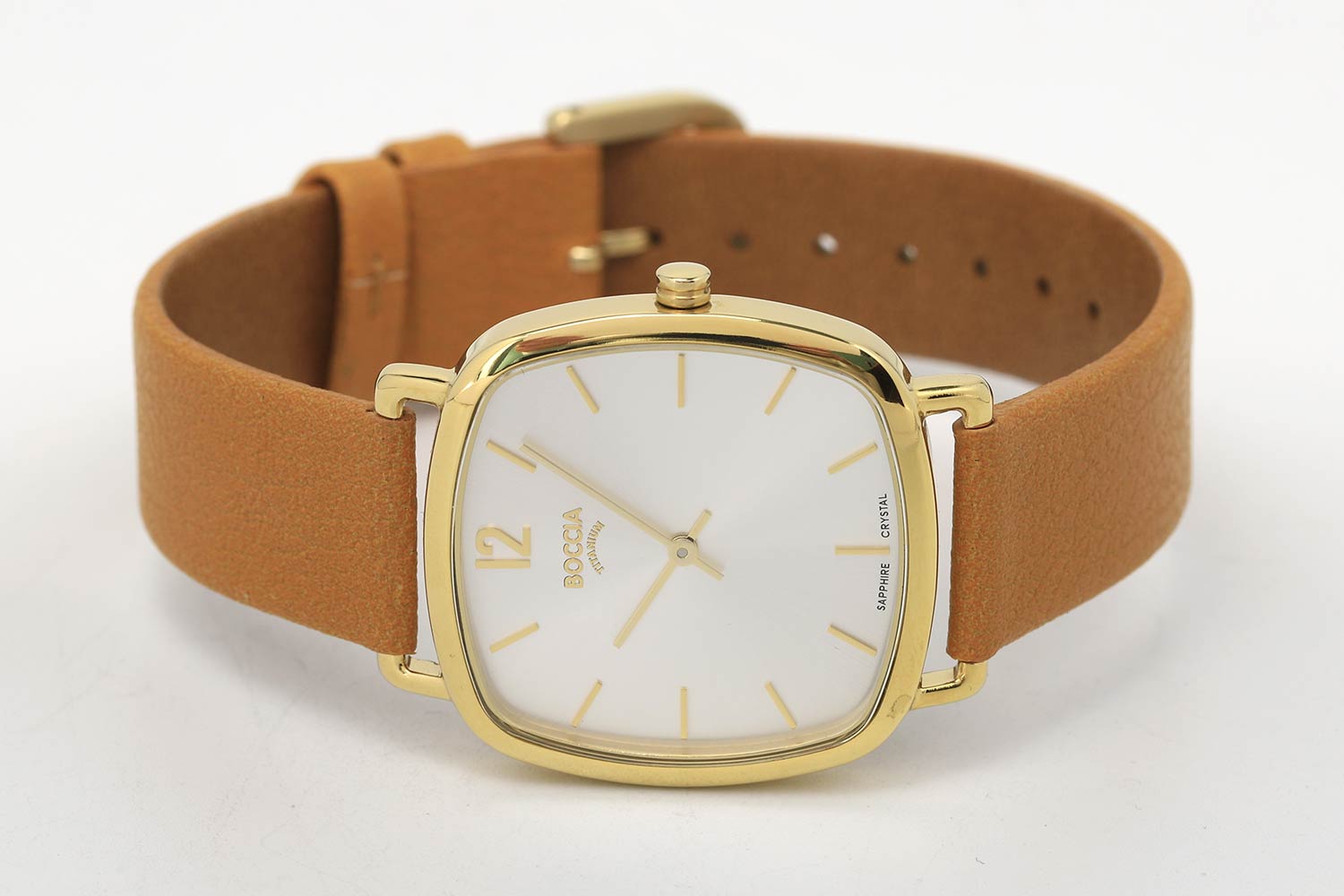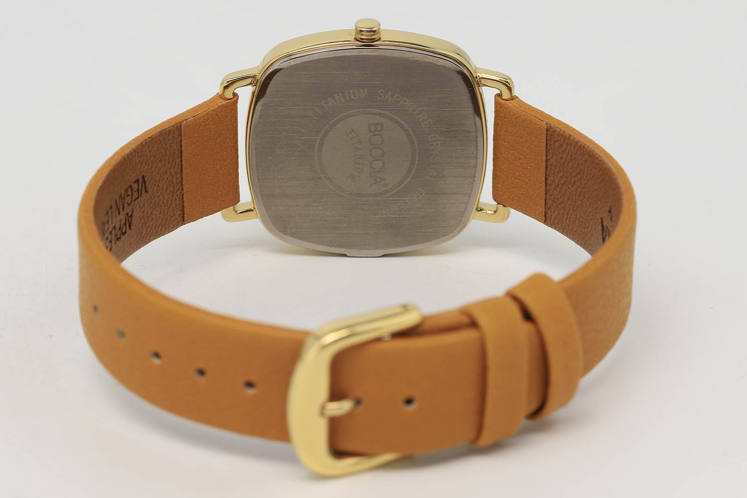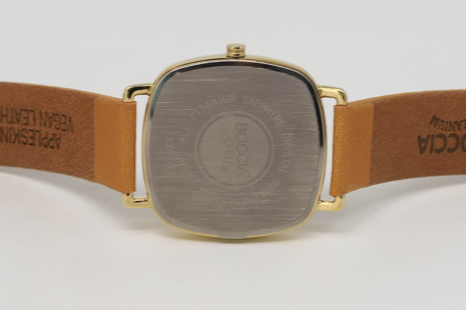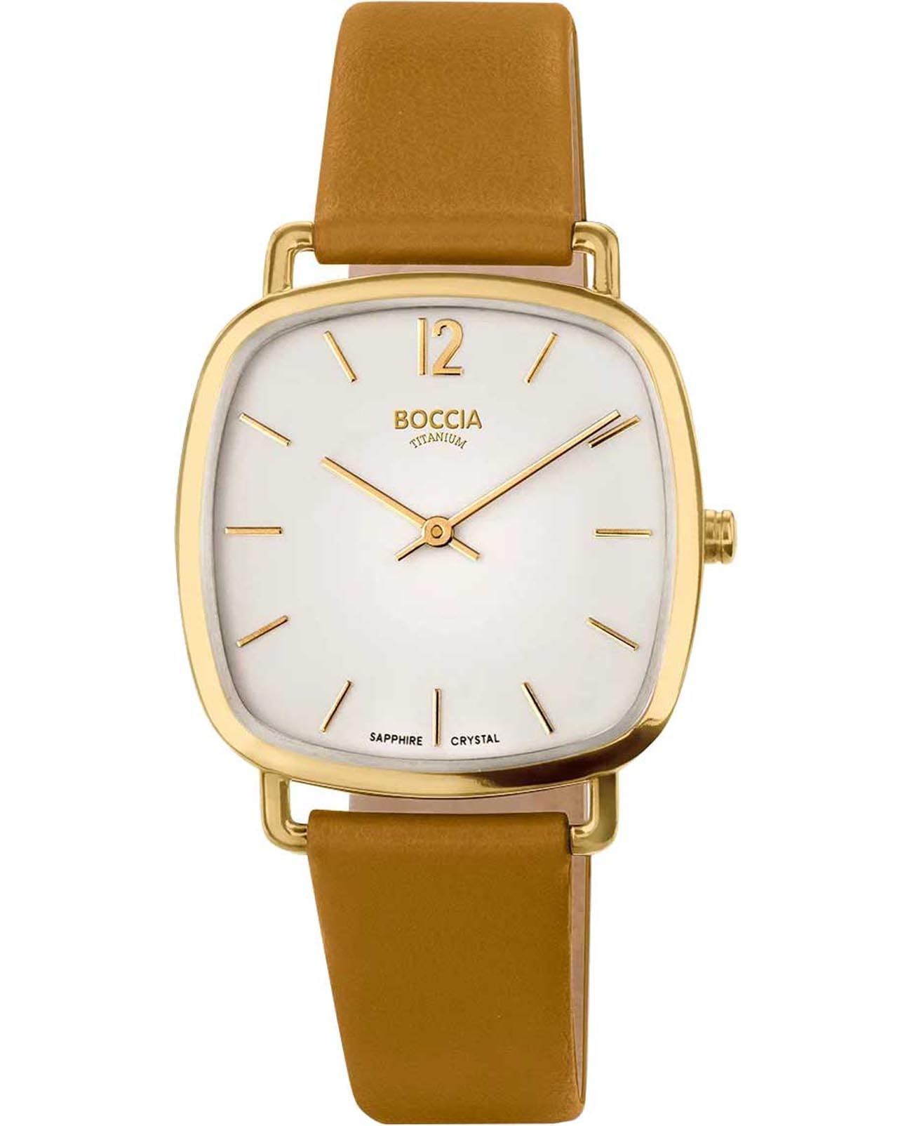 Женские наручные часы Boccia Titanium 3334-03 с надёжным кварцевым механизмом. Корпус часов изготовлен из титана с PVD-покрытиемPVDУльтратонкое покрытие наносится в технике вакуумного напыления, сочетает в себе нитрид титана особой прочности со слоем золота или оксида хрома. Несёт в себе декоративную или защитную функцию.. Сапфировое стеклоСапфировое стеклоПрочный и надёжный материал из кристалла сапфира синтетического происхождения, характеризующийся особой твёрдостью и устойчивостью к царапинам и повреждениям. устойчивое к мелким механическим повреждениям. Класс водозащиты: 30 метров, позволит защитить корпус от случайных брызг или капель дождя. Кожаный ремешок на стандартной застёжке.
