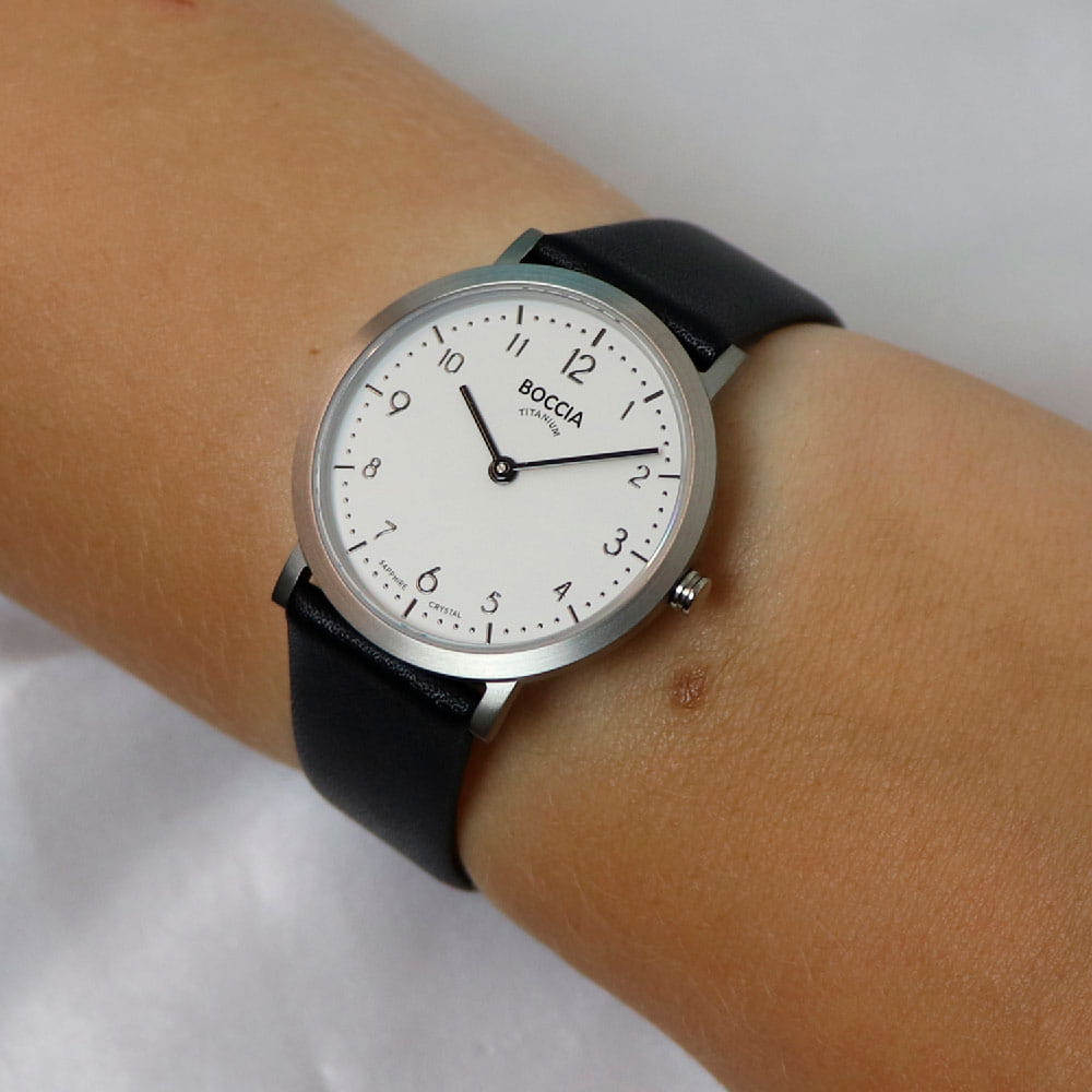 Женские наручные часы Boccia Titanium 3335-01 с надёжным кварцевым механизмом. Корпус часов изготовлен из титана. Сапфировое стеклоСапфировое стеклоПрочный и надёжный материал из кристалла сапфира синтетического происхождения, характеризующийся особой твёрдостью и устойчивостью к царапинам и повреждениям. устойчивое к мелким механическим повреждениям. Класс водозащиты: 50 метров, позволит защитить корпус от случайных брызг или капель дождя. Кожаный ремешок на стандартной застёжке.