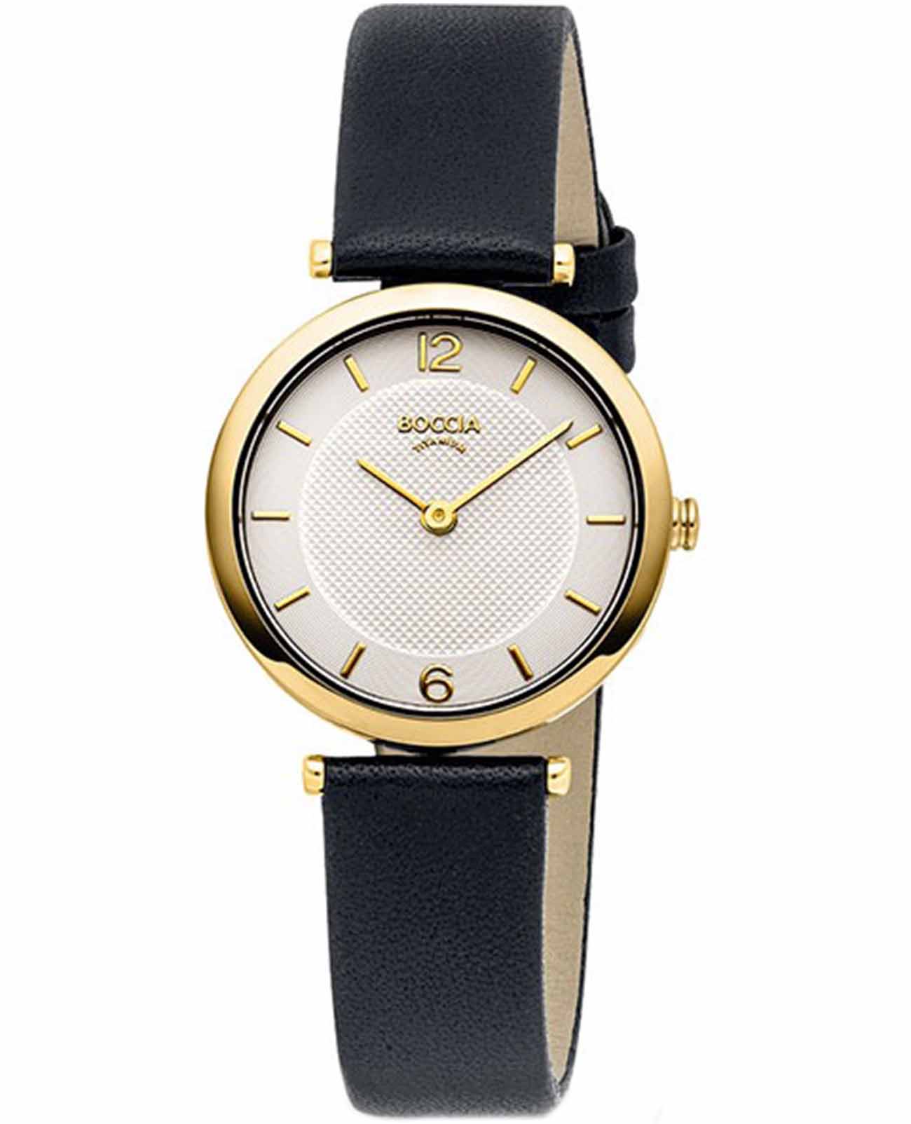 Часы Boccia 3362-02 — это утонченный аксессуар для женщин, сочетающий в себе элегантность и надежность. Эти кварцевые часы оснащены механизмом Miyota GL22, который обеспечивает точность хода. Серебристый циферблат придает модели классическую изысканность, гармонично сочетаясь с круглым корпусом из гипоаллергенного титана с PVDPVDУльтратонкое покрытие наносится в технике вакуумного напыления, сочетает в себе нитрид титана особой прочности со слоем золота или оксида хрома. Несёт в себе декоративную или защитную функцию.-покрытием цвета желтого золота. Диаметр корпуса составляет 30 мм, что делает часы аккуратными и элегантными, идеально подходящими для женской руки. Черный кожаный ремешок с классической застежкой добавляет комфорта и завершает стильный образ. Часы защищены прочным минеральным стекломМинеральное стеклоМинеральное стекло представляет собой искусственно выращенный минерал кварца. Такое стекло отличается особой устойчивостью к повреждениям и царапинам. Уступает по некоторым качествам сапфировому стеклу., устойчивым к мелким механическим повреждениям, что обеспечивает их долговечность и сохранение презентабельного вида. Водостойкость на уровне WR 50 позволяет не беспокоиться о попадании воды при мытье рук или в дождливую погоду. долговечность.