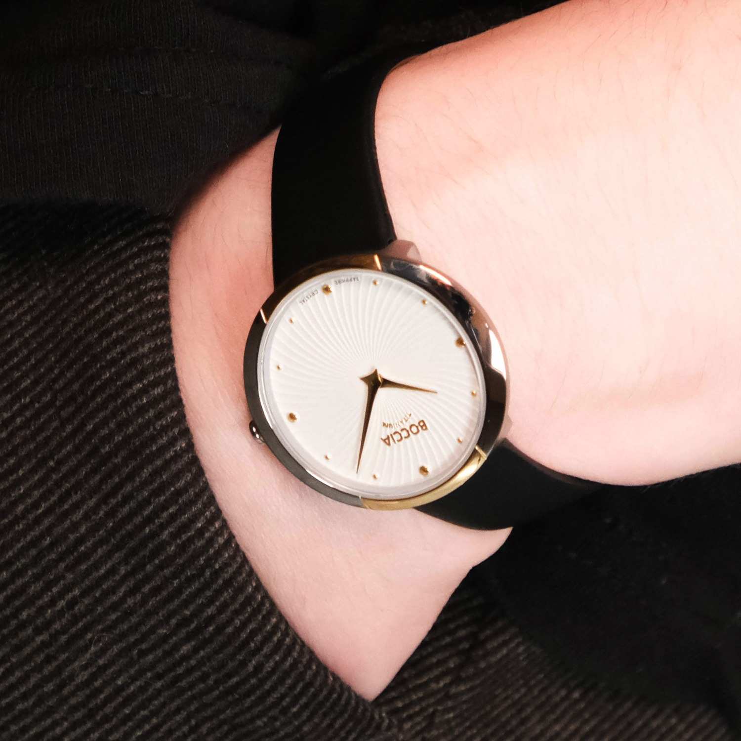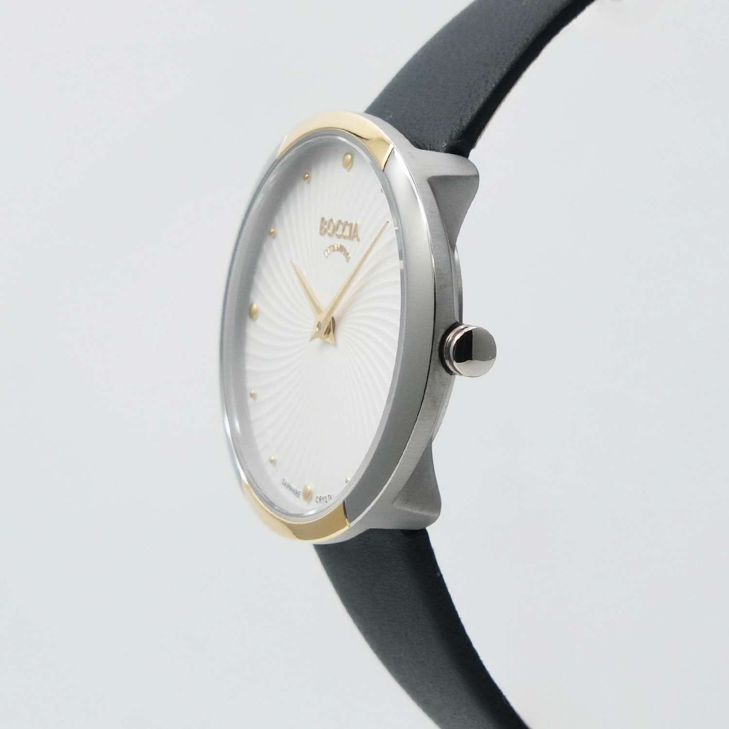 Женские часы Boccia Titanium 3364-03 станут прекрасным дополнением вашего стильного образа. Эти часы оснащены надежным кварцевым механизмом Miyota GL22, обеспечивающим точное время. Центральные часовая и минутная стрелки аккуратно выделяются на белом гильошированном циферблате, придавая часам элегантный вид. Корпус часов выполнен из суперлегкого титана с частичным PVDPVDУльтратонкое покрытие наносится в технике вакуумного напыления, сочетает в себе нитрид титана особой прочности со слоем золота или оксида хрома. Несёт в себе декоративную или защитную функцию.-покрытием цвета желтого золота, что делает их не только прочными, но и невероятно комфортными в ношении. Овальная форма корпуса размером 30 х 32 мм добавляет изысканности и утонченности. Черный кожаный ремешок с классической застежкой гармонично дополняет общий стиль часов. Сапфировое стеклоСапфировое стеклоПрочный и надёжный материал из кристалла сапфира синтетического происхождения, характеризующийся особой твёрдостью и устойчивостью к царапинам и повреждениям., устойчивое к появлению царапин, надежно защищает циферблат, обеспечивая долговечность и сохранение первоначального внешнего вида. Водостойкость уровня WR 50 позволяет не беспокоиться о попадании влаги при мытье рук или в дождливую погоду.