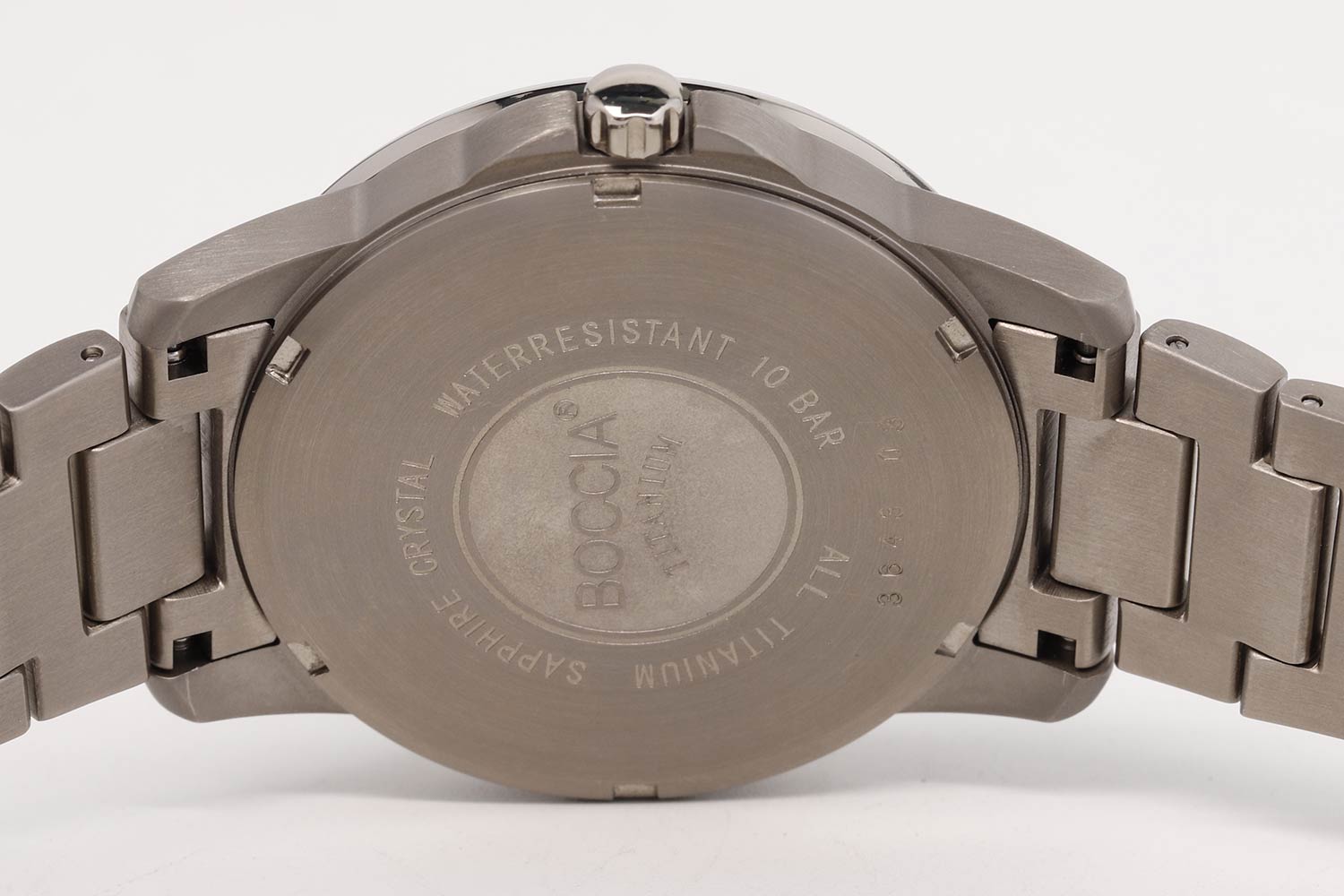 Мужские наручные часы Boccia Titanium 3643-03 с надёжным кварцевым механизмом. Питание от солнечной энергии. Корпус и браслет часов изготовлены из титана. Сапфировое стеклоСапфировое стеклоПрочный и надёжный материал из кристалла сапфира синтетического происхождения, характеризующийся особой твёрдостью и устойчивостью к царапинам и повреждениям. устойчивое к мелким механическим повреждениям. Класс водозащиты: 100 метров, позволит плавать, нырять и заниматься другими водными видами спорта. Окошко даты в положении 3 часа. Титановый браслет на раскладной застёжкеРаскладная застёжкаТакой тип застёжки используется только на браслетах из металла. Она никогда не раскрывается полностью, происходит разделение на 2 и более частей. Раскладывающая застёжка снизит вероятность потери часов к минимуму.. Стрелки и метки с люминесцентным покрытиемЛюминесцентное покрытиеПозволяет считывать показания времени в темноте. Производители наносят на стрелки, часовые индексы, безель или поверхность циферблата светонакопительный состав, дающий холодное свечение..