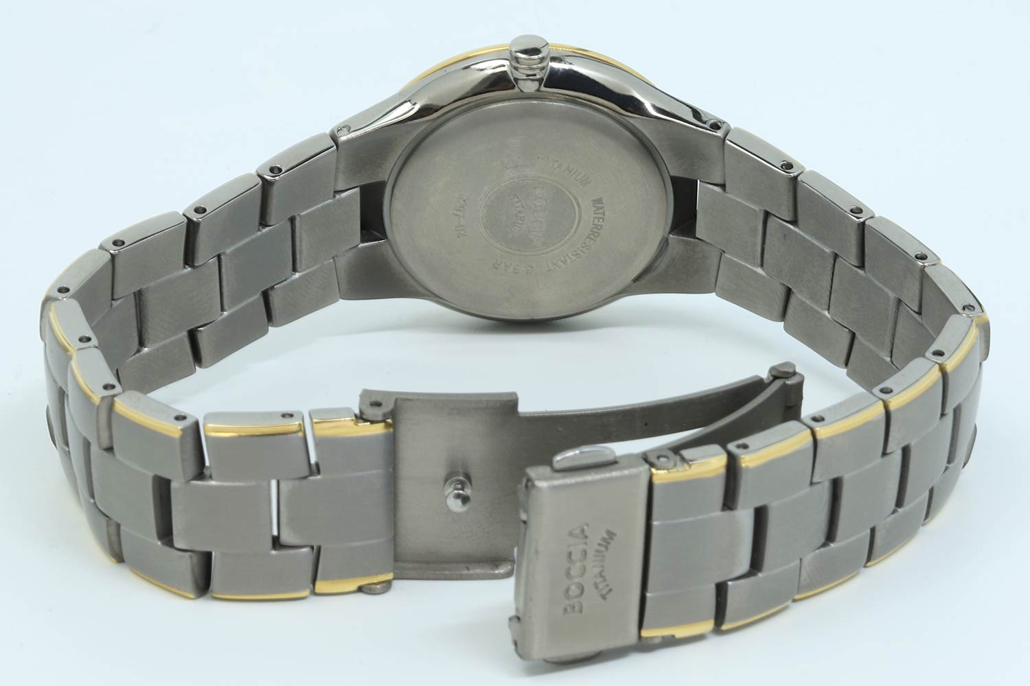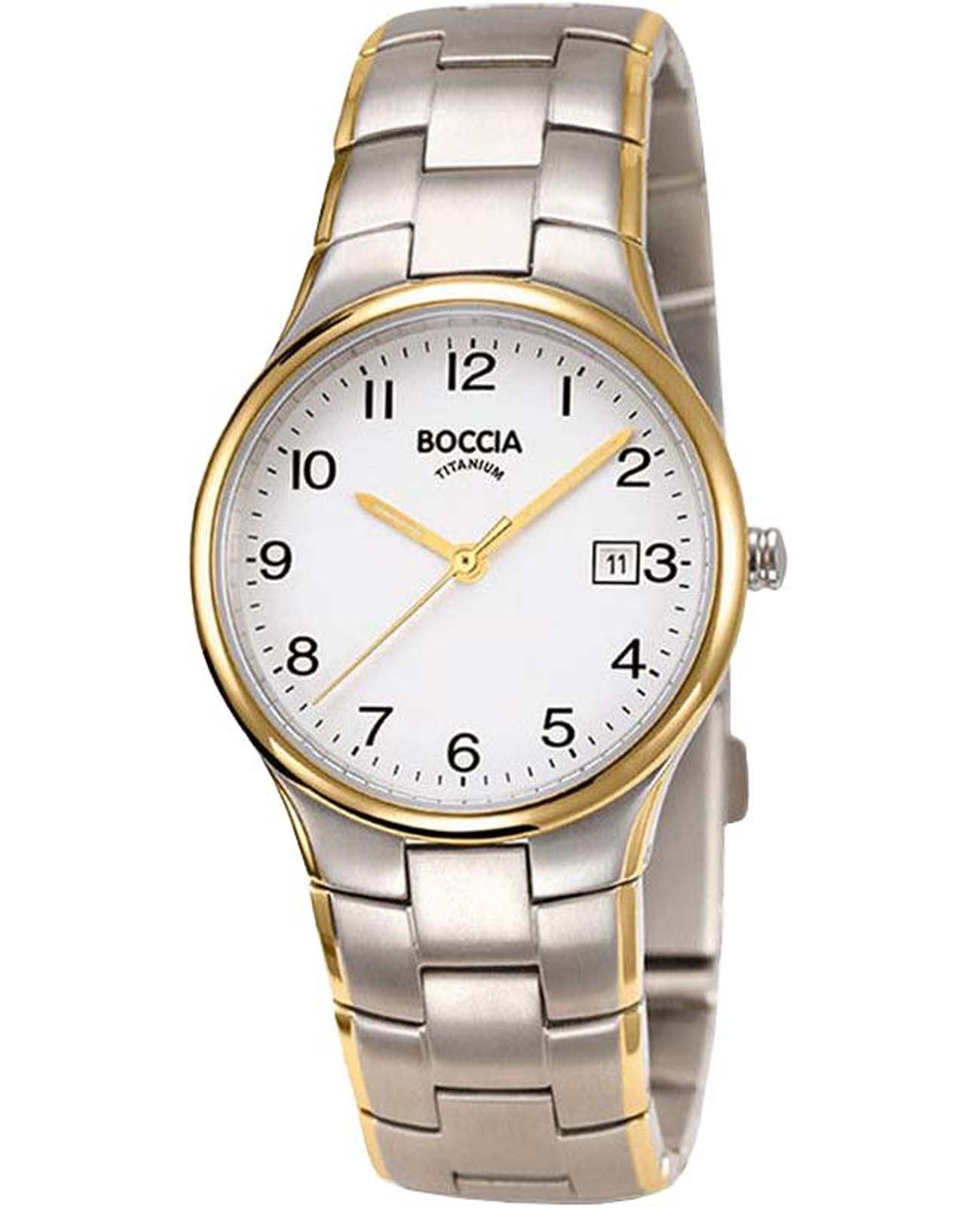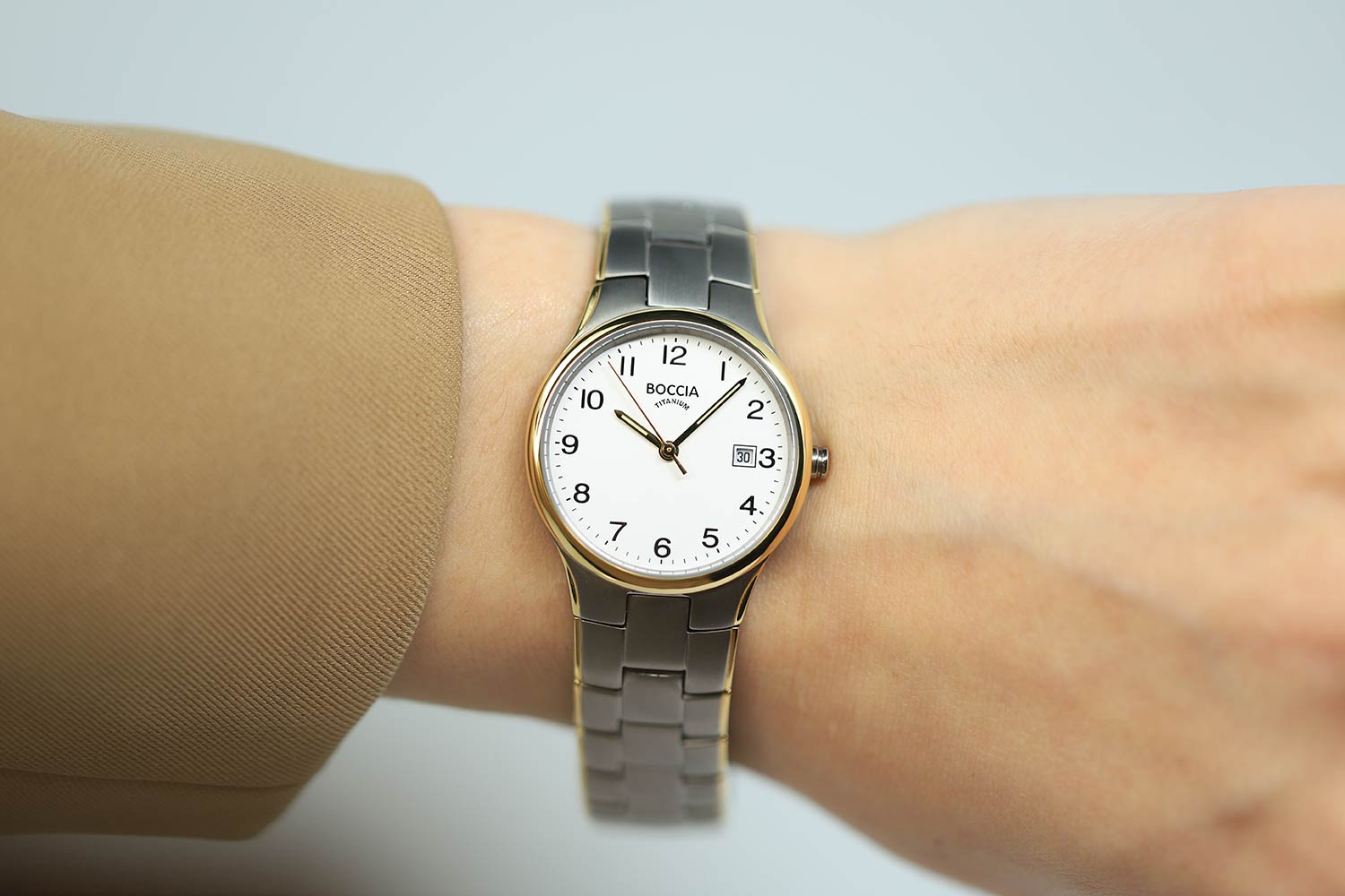 Женские наручные часы Boccia Titanium 3297-02 с надёжным кварцевым механизмом. Корпус и браслет часов изготовлены из титана с частичным PVD-покрытиемPVDУльтратонкое покрытие наносится в технике вакуумного напыления, сочетает в себе нитрид титана особой прочности со слоем золота или оксида хрома. Несёт в себе декоративную или защитную функцию.. Минеральное стеклоМинеральное стеклоМинеральное стекло представляет собой искусственно выращенный минерал кварца. Такое стекло отличается особой устойчивостью к повреждениям и царапинам. Уступает по некоторым качествам сапфировому стеклу. устойчивое к мелким механическим повреждениям. Класс водозащиты: 50 метров, позволит защитить корпус от случайных брызг или капель дождя. Стрелки с люминесцентным покрытиемЛюминесцентное покрытиеПозволяет считывать показания времени в темноте. Производители наносят на стрелки, часовые индексы, безель или поверхность циферблата светонакопительный состав, дающий холодное свечение.. Титановый браслет на раскладной застёжкеРаскладная застёжкаТакой тип застёжки используется только на браслетах из металла. Она никогда не раскрывается полностью, происходит разделение на 2 и более частей. Раскладывающая застёжка снизит вероятность потери часов к минимуму.. Окошко даты находится в положении 3 часа.