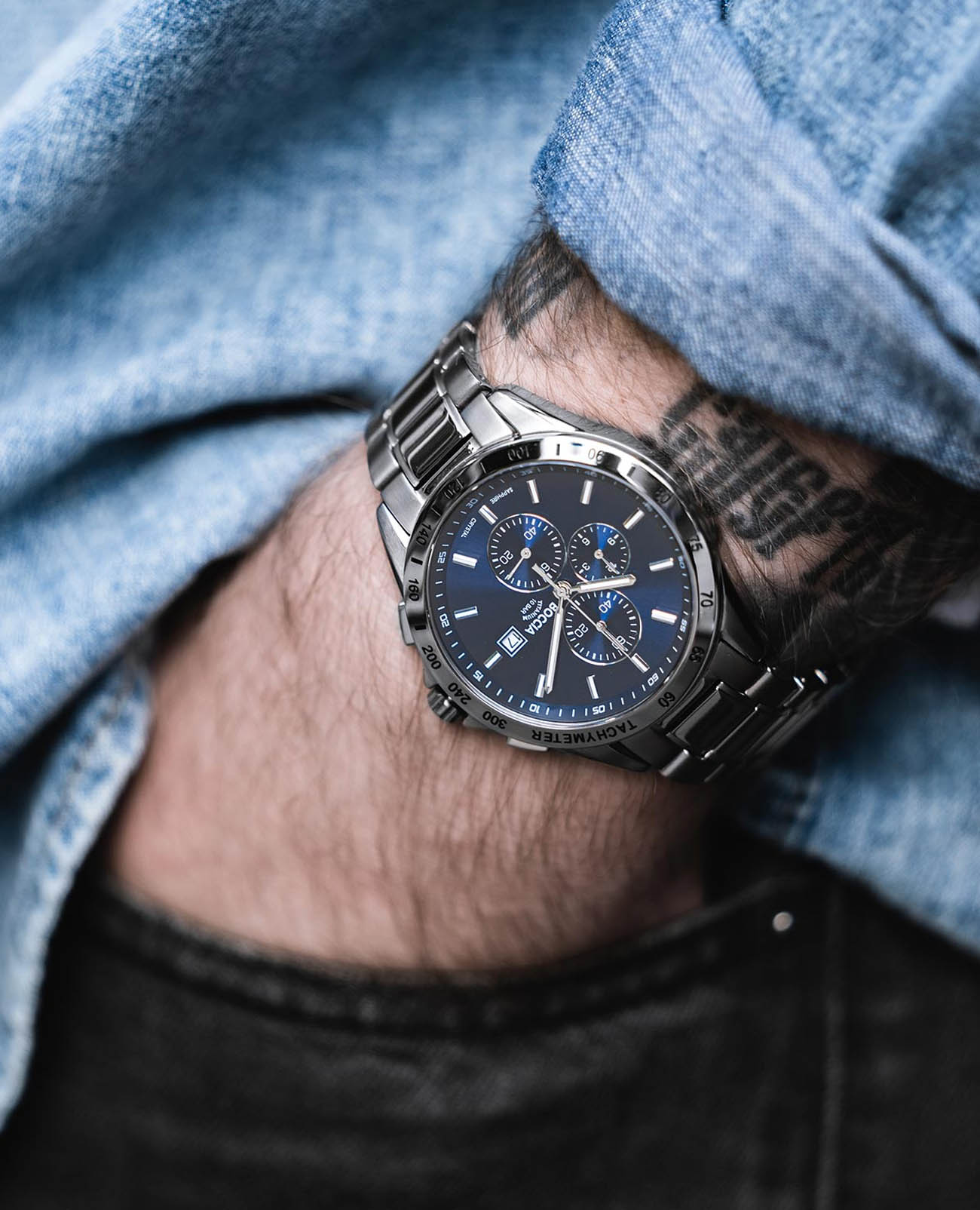 Мужские немецкие титановые часы-хронографХронографФункция позволяет измерять отрезки времени с особой точностью: часы, минуты, секунды. Верным признаком хронографа является наличие на циферблате 3 дополнительных окошек-счётчиков. с секундомеромСекундомерСекундоме́р — прибор, способный измерять интервалы времени с точностью до долей секунды. Boccia Titanium Circle-Oval 3751-01, кварцевый механизм с высокой точностью. Минеральное стеклоМинеральное стеклоМинеральное стекло представляет собой искусственно выращенный минерал кварца. Такое стекло отличается особой устойчивостью к повреждениям и царапинам. Уступает по некоторым качествам сапфировому стеклу. устойчивое к появлению царапин, обладающее высокой прозрачностью. Корпус изготовлен из титана. БезельБезельВнешний ободок, закрепляющий стекло. В спортивных часах так называется поворотное кольцо с делениями на циферблате, выполняет роль таймера – замеряет отрезки времени на шкале. Неподвижный безель – элемент декора. Однонаправленно вращающийся безель на дайверских часах позволяет фиксировать моменты погружения и выныривания на поверхность. из титана со шкалой тахиметрТахиметрРазмеченная шкала, располагается на ободке или безеле часов. Тахиметр позволяет рассчитать скорость на определённом участке пути, расстояние измеряется в километрах или милях.. На цифрблате расположены три дополнительных индикатора и окошко даты. Стрелки с люминесцентным покрытиемЛюминесцентное покрытиеПозволяет считывать показания времени в темноте. Производители наносят на стрелки, часовые индексы, безель или поверхность циферблата светонакопительный состав, дающий холодное свечение.. Класс водозащиты: 100 метров, позволит плавать, нырять и заниматься другими водными видами спорта. Браслет из титана на раскладной застёжкеРаскладная застёжкаТакой тип застёжки используется только на браслетах из металла. Она никогда не раскрывается полностью, происходит разделение на 2 и более частей. Раскладывающая застёжка снизит вероятность потери часов к минимуму..