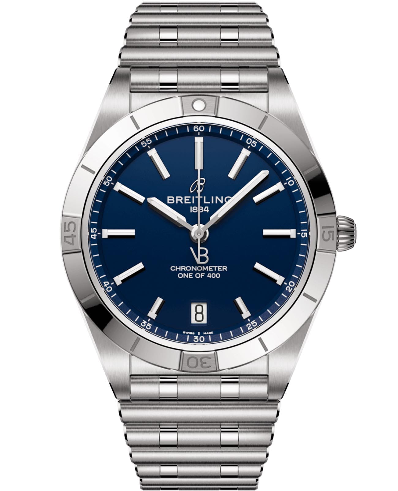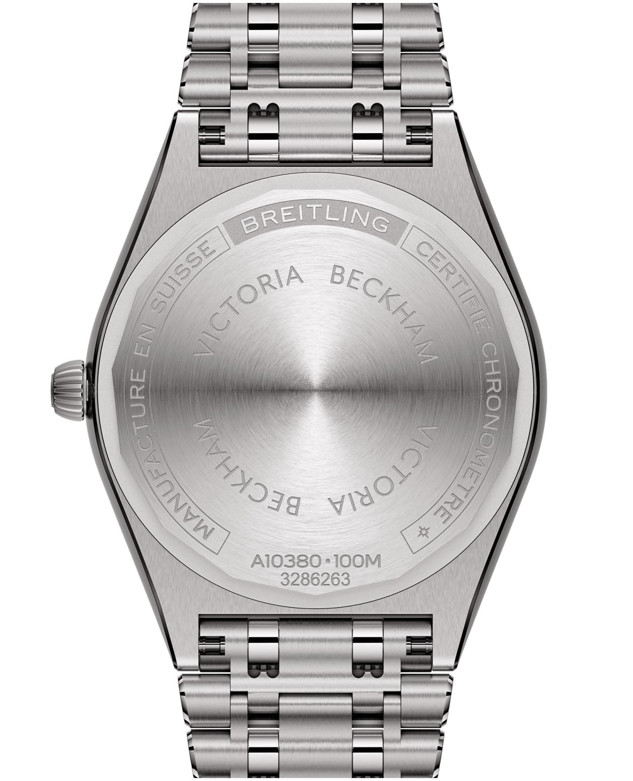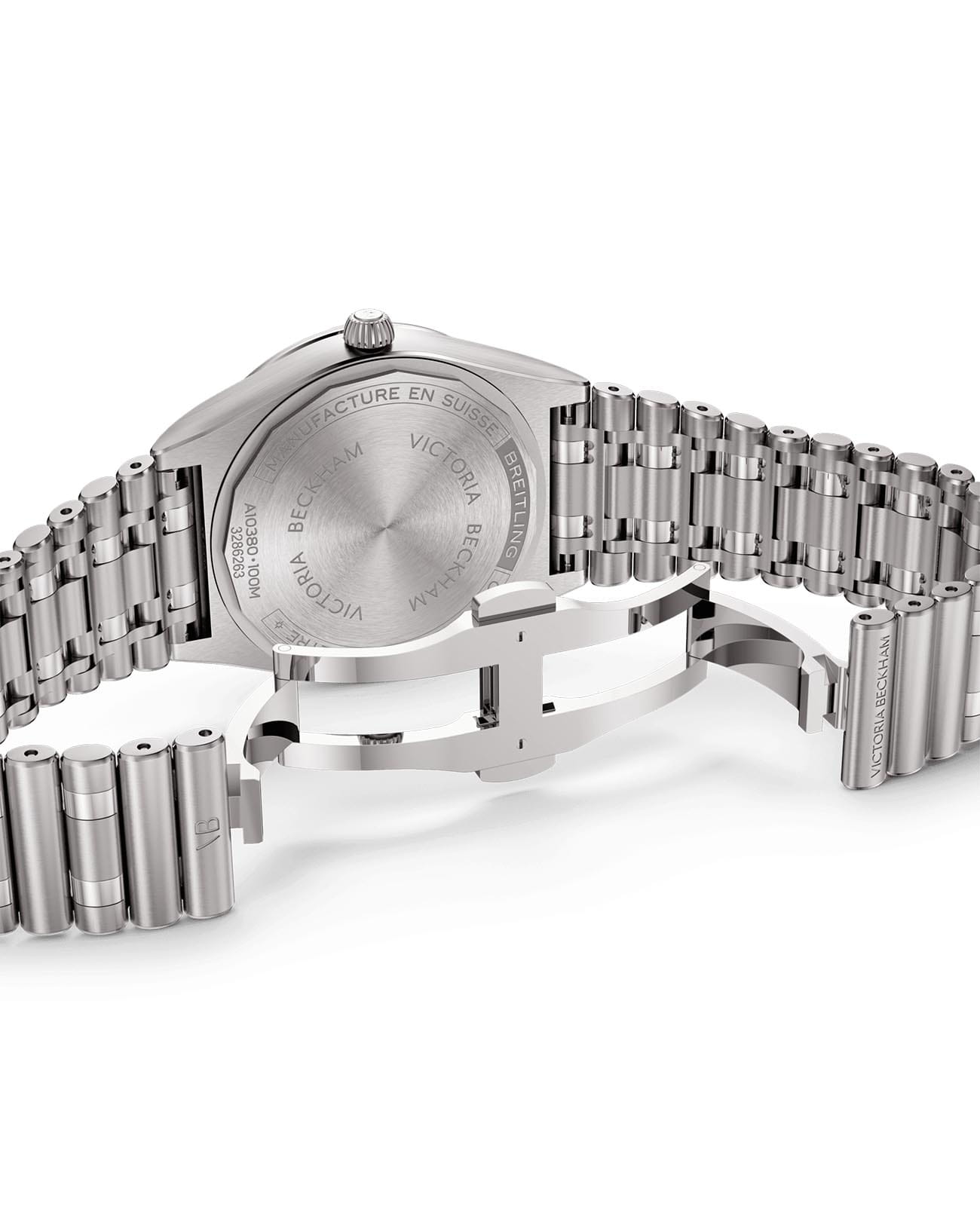 Женские швейцарские часы Breitling Chronomat Automatic 36 Victoria Beckham A103801A1C1A1 с надёжным автоматическим механизмом, выпущенные лимитированной серией всего из 1500 экземпляров в сотрудничестве с модным домом Victoria Beckham. Сапфировое стеклоСапфировое стеклоПрочный и надёжный материал из кристалла сапфира синтетического происхождения, характеризующийся особой твёрдостью и устойчивостью к царапинам и повреждениям. устойчивое к мелким механическим повреждениям. Корпус и браслет часов изготовлены из нержавеющей стали. Стальной браслет на застёжке-бабочке с кнопкамиЗастёжка "бабочка"Такой вид застёжки дополняется предохранителями, помогающими избежать случайного раскрытия браслета. Обладают изящным исполнением. . Стрелки и метки с люминесцентным покрытиемЛюминесцентное покрытиеПозволяет считывать показания времени в темноте. Производители наносят на стрелки, часовые индексы, безель или поверхность циферблата светонакопительный состав, дающий холодное свечение.. Класс водозащиты: 100 метров, позволит плавать, нырять и заниматься другими водными видами спорта. Окошко даты находится в положении 6 часов.