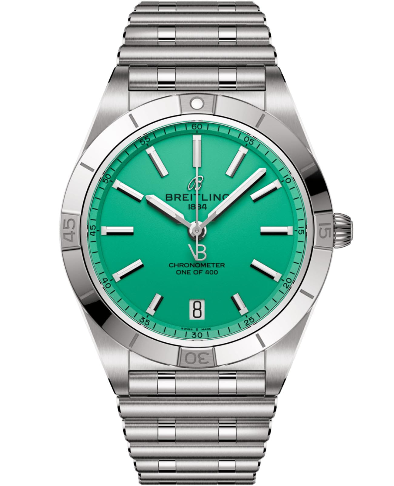 Женские швейцарские часы Breitling Chronomat Automatic 36 Victoria Beckham A103801A1L1A1 с надёжным автоматическим механизмом, выпущенные лимитированной серией всего из 1500 экземпляров в сотрудничестве с модным домом Victoria Beckham. Сапфировое стеклоСапфировое стеклоПрочный и надёжный материал из кристалла сапфира синтетического происхождения, характеризующийся особой твёрдостью и устойчивостью к царапинам и повреждениям. устойчивое к мелким механическим повреждениям. Корпус и браслет часов изготовлены из нержавеющей стали. Стальной браслет на застёжке-бабочке с кнопкамиЗастёжка "бабочка"Такой вид застёжки дополняется предохранителями, помогающими избежать случайного раскрытия браслета. Обладают изящным исполнением. . Стрелки и метки с люминесцентным покрытиемЛюминесцентное покрытиеПозволяет считывать показания времени в темноте. Производители наносят на стрелки, часовые индексы, безель или поверхность циферблата светонакопительный состав, дающий холодное свечение.. Класс водозащиты: 100 метров, позволит плавать, нырять и заниматься другими водными видами спорта. Окошко даты находится в положении 6 часов.