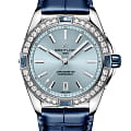 Женские швейцарские часы Breitling Super Chronomat Automatic 38 A17356531C1P1, механический механизм (автоматический калибр) с высокой точностью. Сапфировое стеклоСапфировое стеклоПрочный и надёжный материал из кристалла сапфира синтетического происхождения, характеризующийся особой твёрдостью и устойчивостью к царапинам и повреждениям. устойчивое к появлению царапин, обладающее высокой прозрачностью. Класс водозащиты: 100 метров, позволит плавать, нырять и заниматься другими водными видами спорта. Корпус часов изготовлен из стали. Кожаный крокодиловый ремешок с раскладной застёжкойРаскладная застёжкаТакой тип застёжки используется только на браслетах из металла. Она никогда не раскрывается полностью, происходит разделение на 2 и более частей. Раскладывающая застёжка снизит вероятность потери часов к минимуму.. Отличить Super от остальных моделей семейства Chronomat можно по керамическим язычкам и заводной головке. Помимо улучшенного внешнего вида, Automatic 38 также имеет сияющую сторону. БезельБезельВнешний ободок, закрепляющий стекло. В спортивных часах так называется поворотное кольцо с делениями на циферблате, выполняет роль таймера – замеряет отрезки времени на шкале. Неподвижный безель – элемент декора. Однонаправленно вращающийся безель на дайверских часах позволяет фиксировать моменты погружения и выныривания на поверхность. из нержавеющей стали украшен крупными бриллиантами, выращенными в лабораторных условиях. Цвета циферблата добавляют как раз нужное количество привлекательности для глаз. Окошко даты находится в положении 6 часов. Стрелки и метки с люминесцентным покрытиемЛюминесцентное покрытиеПозволяет считывать показания времени в темноте. Производители наносят на стрелки, часовые индексы, безель или поверхность циферблата светонакопительный состав, дающий холодное свечение..