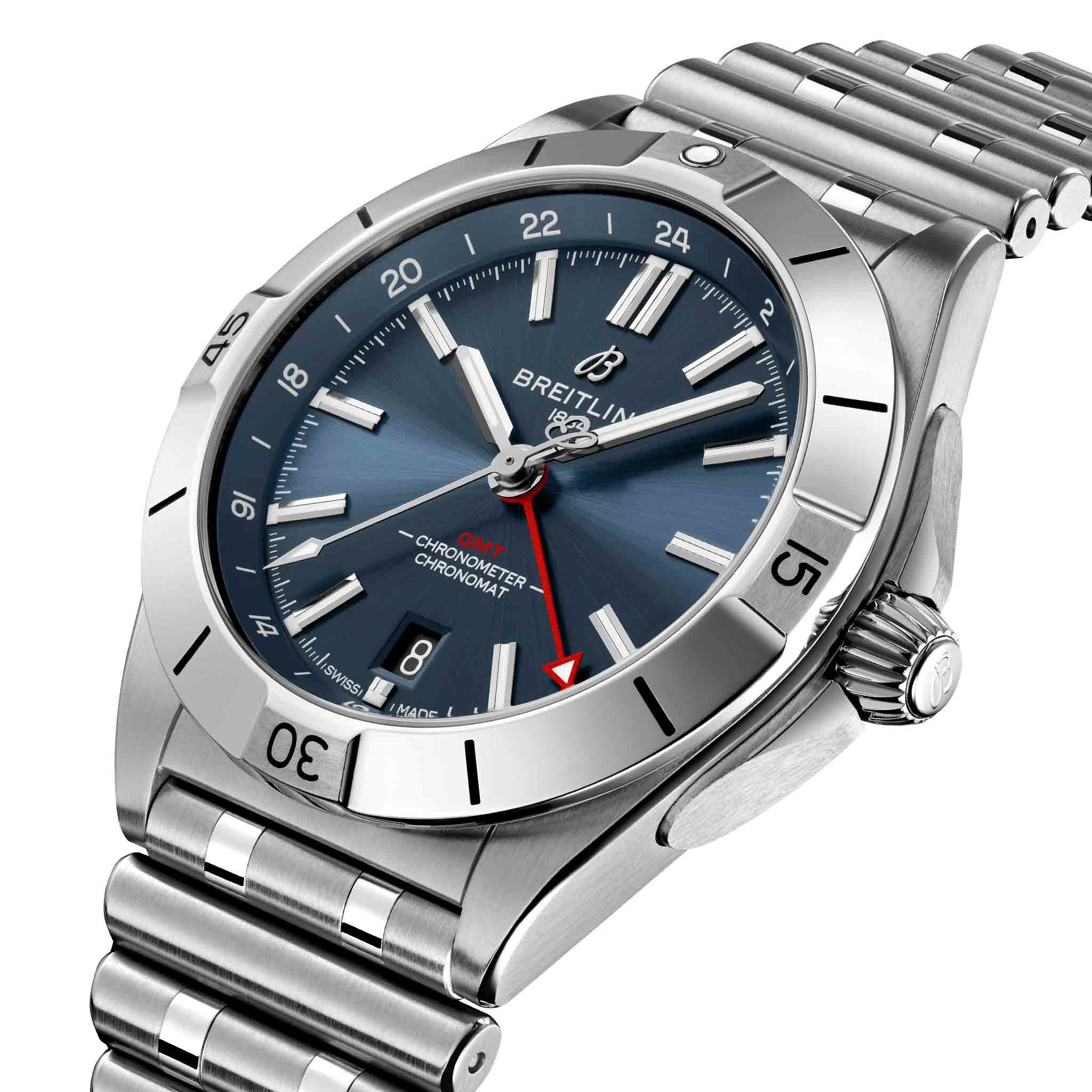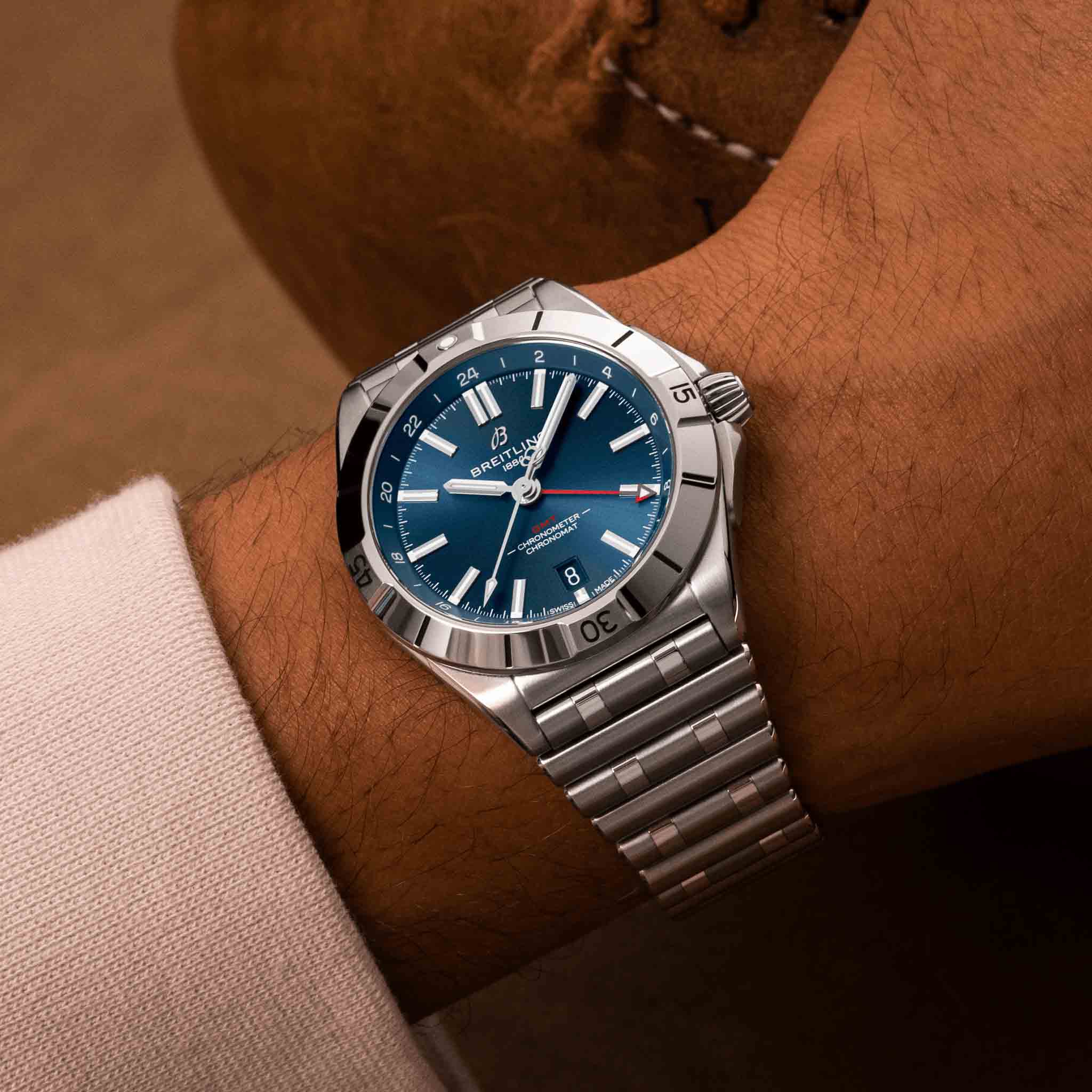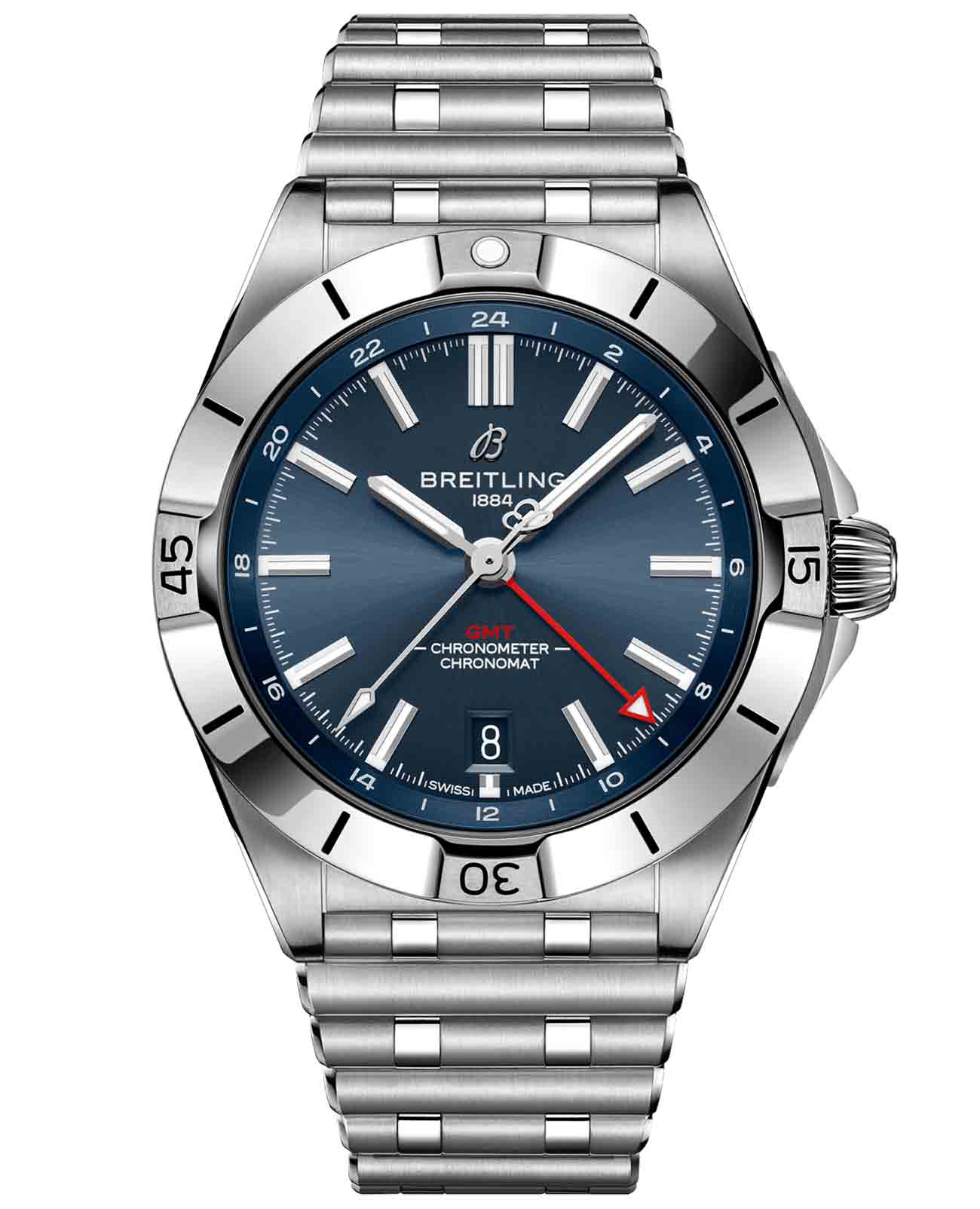 Мужские швейцарские часы Breitling Chronomat Automatic GMT 40 A32398101C1A1, механический механизм (автоматический калибр) с высокой точностью. Часы Chronomat Automatic GMTGMTОтображение времени второго часового пояса.Такая функция особенно актуальна для путешественников и бизнесменов,которые общаются с людьми из разных стран,теперь вы всегда будете знать,какой час у вашего партнёра или близкого человека. 40 - это дань уважения Breitling путешествиям не только благодаря дисплею с двумя часовыми поясами, но и благодаря своей непринужденной эстетике. 24-часовая шкала позволяет пользователю отслеживать второй часовой пояс и с первого взгляда определять, день сейчас или ночь, а заводная головка “луковица” (классическая функция хронометра, получившая название из-за своей рифленой формы купола) позволяет легко регулировать время. Сапфировое стеклоСапфировое стеклоПрочный и надёжный материал из кристалла сапфира синтетического происхождения, характеризующийся особой твёрдостью и устойчивостью к царапинам и повреждениям. устойчивое к появлению царапин, обладающее высокой прозрачностью. Класс водозащиты: 200 метров, позволит плавать, нырять и заниматься другими водными видами спорта. Корпус часов изготовлен из стали. Стальной браслет с застёжкой-бабочкой с кнопкамиЗастёжка "бабочка"Такой вид застёжки дополняется предохранителями, помогающими избежать случайного раскрытия браслета. Обладают изящным исполнением. . Стрелки и метки с люминесцентным покрытиемЛюминесцентное покрытиеПозволяет считывать показания времени в темноте. Производители наносят на стрелки, часовые индексы, безель или поверхность циферблата светонакопительный состав, дающий холодное свечение.. Часы имеют сертификат COSCСертификат COSCОфициальный сертификат, подтверждающий то, что часы ходят с особо высокой точностью. Для получения документа часы подвергаются тестовым испытаниям, разработанным швейцарским институтом тестирования хронометров COSC. Допустимая норма для механических часов -4/+6 секунд в день, для кварцевых моделей +/- 0,07 секунд в день.. Окошко даты находится в положении 6 часов. Известные как “часы на все случаи жизни”, часы Chronomat сейчас актуальны как никогда благодаря практичным размерам GMT 40 и сдержанному стилю.