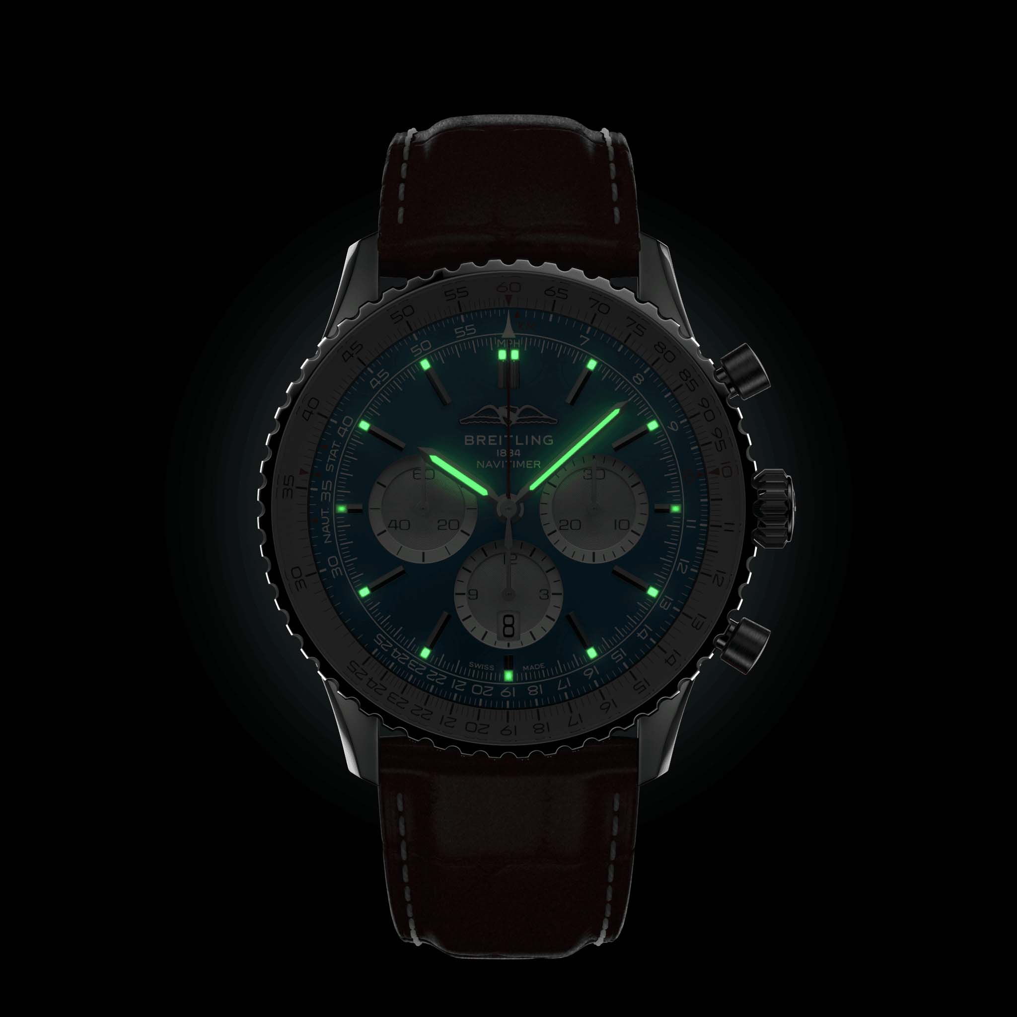 Мужские швейцарские часы-хронографХронографФункция позволяет измерять отрезки времени с особой точностью: часы, минуты, секунды. Верным признаком хронографа является наличие на циферблате 3 дополнительных окошек-счётчиков. с секундомеромСекундомерСекундоме́р — прибор, способный измерять интервалы времени с точностью до долей секунды. Breitling Navitimer B01 Chronograph 46 AB0137211C1P1, механический механизм (автоматический калибр) с высокой точностью. Сапфировое стеклоСапфировое стеклоПрочный и надёжный материал из кристалла сапфира синтетического происхождения, характеризующийся особой твёрдостью и устойчивостью к царапинам и повреждениям. с антибликовым покрытием устойчивое к появлению царапин, обладающее высокой прозрачностью. Класс водозащиты: 30 метров, позволит защитить корпус от случайных брызг или капель дождя. Корпус часов изготовлен из стали. Кожаный ремешок с раскладной застёжкойРаскладная застёжкаТакой тип застёжки используется только на браслетах из металла. Она никогда не раскрывается полностью, происходит разделение на 2 и более частей. Раскладывающая застёжка снизит вероятность потери часов к минимуму.. Шкала тахиметраТахиметрРазмеченная шкала, располагается на ободке или безеле часов. Тахиметр позволяет рассчитать скорость на определённом участке пути, расстояние измеряется в километрах или милях. на циферблате. Часы имеют сертификат COSCСертификат COSCОфициальный сертификат, подтверждающий то, что часы ходят с особо высокой точностью. Для получения документа часы подвергаются тестовым испытаниям, разработанным швейцарским институтом тестирования хронометров COSC. Допустимая норма для механических часов -4/+6 секунд в день, для кварцевых моделей +/- 0,07 секунд в день.. Окошко даты находится в положении 6 часов. Стрелки и метки с люминесцентным покрытиемЛюминесцентное покрытиеПозволяет считывать показания времени в темноте. Производители наносят на стрелки, часовые индексы, безель или поверхность циферблата светонакопительный состав, дающий холодное свечение..