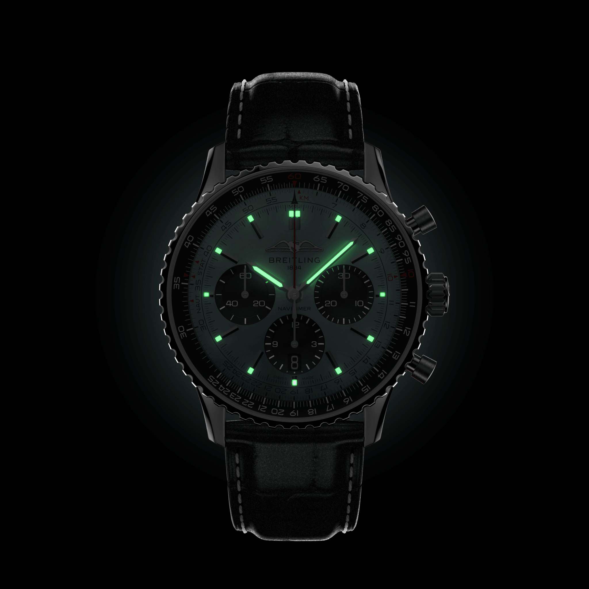 Мужские швейцарские часы-хронографХронографФункция позволяет измерять отрезки времени с особой точностью: часы, минуты, секунды. Верным признаком хронографа является наличие на циферблате 3 дополнительных окошек-счётчиков. с секундомеромСекундомерСекундоме́р — прибор, способный измерять интервалы времени с точностью до долей секунды. Breitling Navitimer B01 Chronograph 43 AB0138241C1P1, механический механизм (автоматический калибр) с высокой точностью. Сапфировое стеклоСапфировое стеклоПрочный и надёжный материал из кристалла сапфира синтетического происхождения, характеризующийся особой твёрдостью и устойчивостью к царапинам и повреждениям. с антибликовым покрытием устойчивое к появлению царапин, обладающее высокой прозрачностью. Класс водозащиты: 30 метров, позволит защитить корпус от случайных брызг или капель дождя. Корпус часов изготовлен из стали. Кожаный ремешок с раскладной застёжкойРаскладная застёжкаТакой тип застёжки используется только на браслетах из металла. Она никогда не раскрывается полностью, происходит разделение на 2 и более частей. Раскладывающая застёжка снизит вероятность потери часов к минимуму.. Шкала тахиметраТахиметрРазмеченная шкала, располагается на ободке или безеле часов. Тахиметр позволяет рассчитать скорость на определённом участке пути, расстояние измеряется в километрах или милях. на циферблате. Часы имеют сертификат COSCСертификат COSCОфициальный сертификат, подтверждающий то, что часы ходят с особо высокой точностью. Для получения документа часы подвергаются тестовым испытаниям, разработанным швейцарским институтом тестирования хронометров COSC. Допустимая норма для механических часов -4/+6 секунд в день, для кварцевых моделей +/- 0,07 секунд в день.. Окошко даты находится в положении 6 часов. Стрелки и метки с люминесцентным покрытиемЛюминесцентное покрытиеПозволяет считывать показания времени в темноте. Производители наносят на стрелки, часовые индексы, безель или поверхность циферблата светонакопительный состав, дающий холодное свечение..