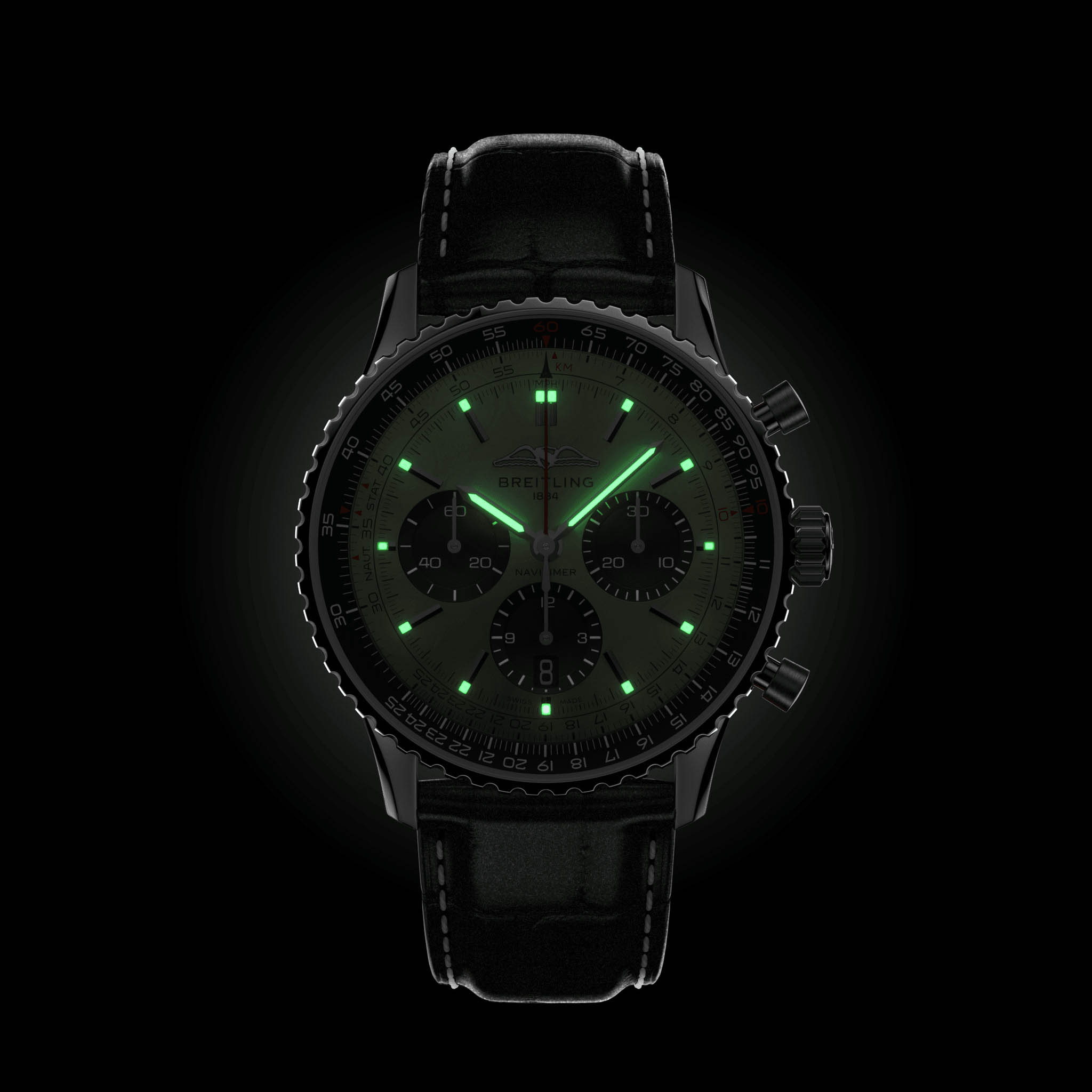 Мужские швейцарские часы-хронографХронографФункция позволяет измерять отрезки времени с особой точностью: часы, минуты, секунды. Верным признаком хронографа является наличие на циферблате 3 дополнительных окошек-счётчиков. с секундомеромСекундомерСекундоме́р — прибор, способный измерять интервалы времени с точностью до долей секунды. Breitling Navitimer B01 Chronograph 43 AB0138241L1P1, механический механизм (автоматический калибр) с высокой точностью. Сапфировое стеклоСапфировое стеклоПрочный и надёжный материал из кристалла сапфира синтетического происхождения, характеризующийся особой твёрдостью и устойчивостью к царапинам и повреждениям. с антибликовым покрытием устойчивое к появлению царапин, обладающее высокой прозрачностью. Класс водозащиты: 30 метров, позволит защитить корпус от случайных брызг или капель дождя. Корпус часов изготовлен из стали. Кожаный ремешок с раскладной застёжкойРаскладная застёжкаТакой тип застёжки используется только на браслетах из металла. Она никогда не раскрывается полностью, происходит разделение на 2 и более частей. Раскладывающая застёжка снизит вероятность потери часов к минимуму.. Шкала тахиметраТахиметрРазмеченная шкала, располагается на ободке или безеле часов. Тахиметр позволяет рассчитать скорость на определённом участке пути, расстояние измеряется в километрах или милях. на циферблате. Часы имеют сертификат COSCСертификат COSCОфициальный сертификат, подтверждающий то, что часы ходят с особо высокой точностью. Для получения документа часы подвергаются тестовым испытаниям, разработанным швейцарским институтом тестирования хронометров COSC. Допустимая норма для механических часов -4/+6 секунд в день, для кварцевых моделей +/- 0,07 секунд в день.. Окошко даты находится в положении 6 часов. Стрелки и метки с люминесцентным покрытиемЛюминесцентное покрытиеПозволяет считывать показания времени в темноте. Производители наносят на стрелки, часовые индексы, безель или поверхность циферблата светонакопительный состав, дающий холодное свечение..